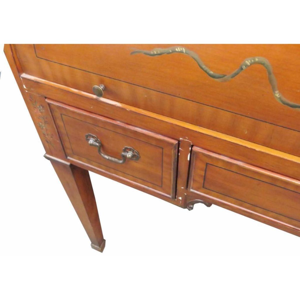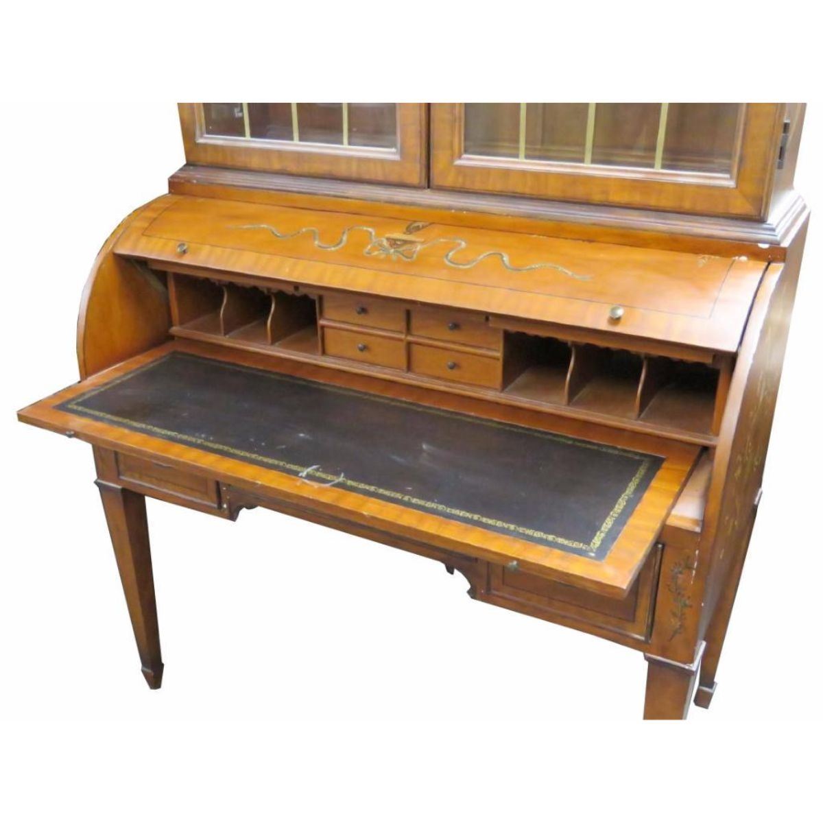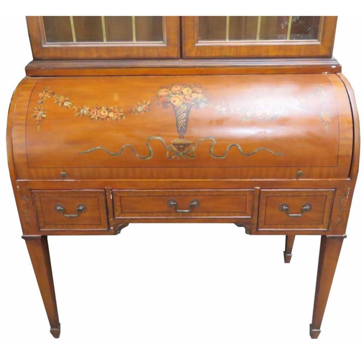 Paint decoration with flowers and swag. Roll top with fitted interior. Bookcase top with glass doors that open to wood shelves. 93"h. x 45 1/2"w. x 23 1/4"d.