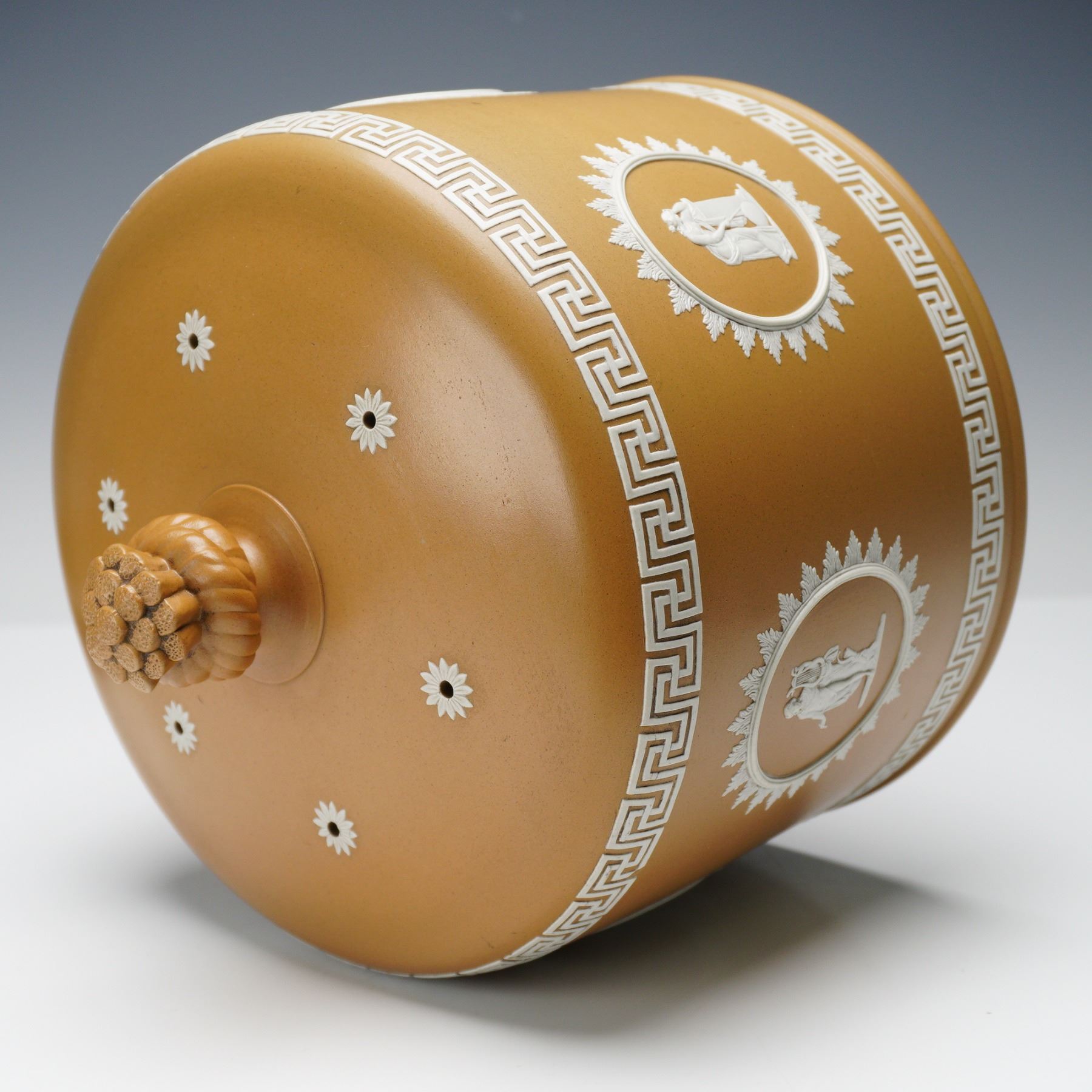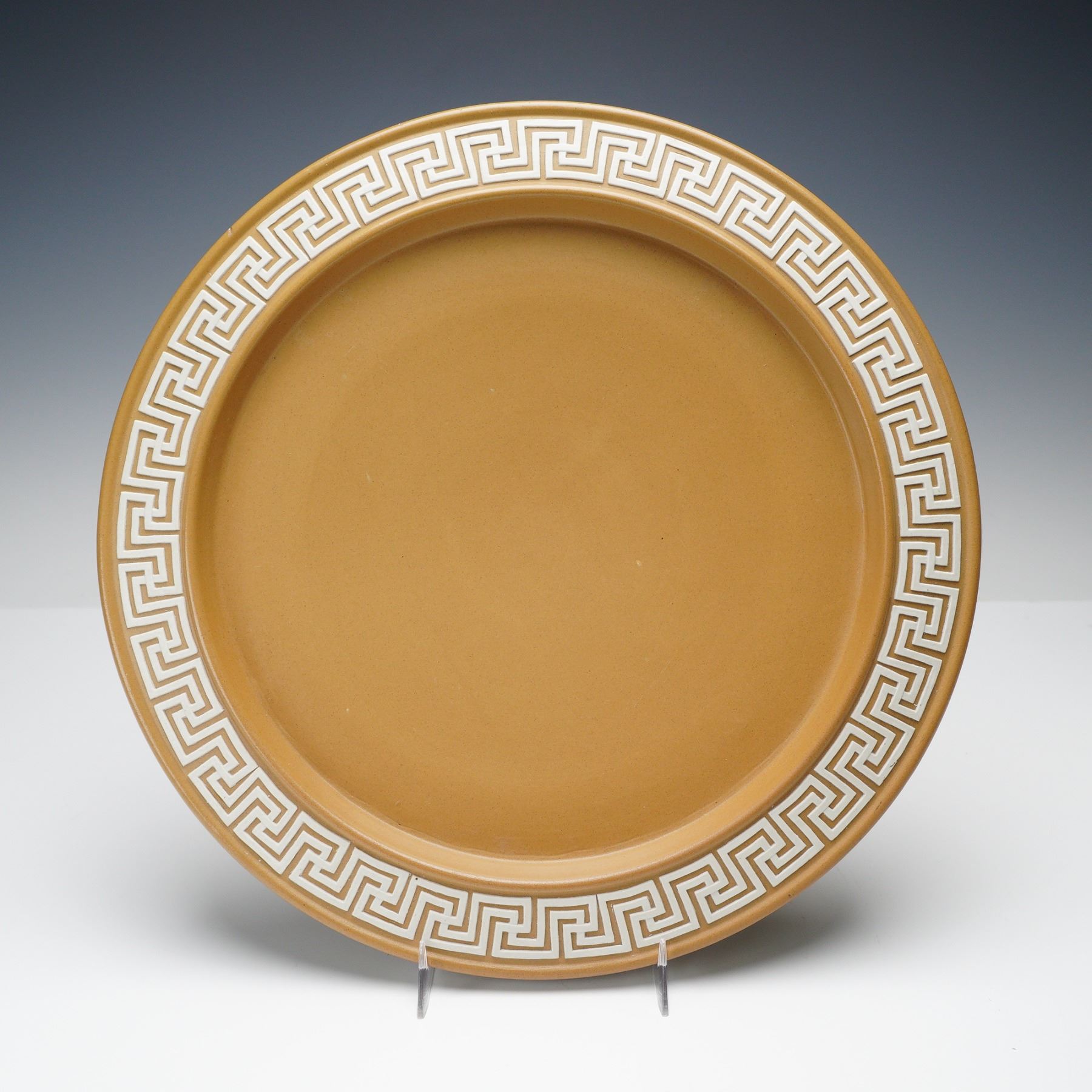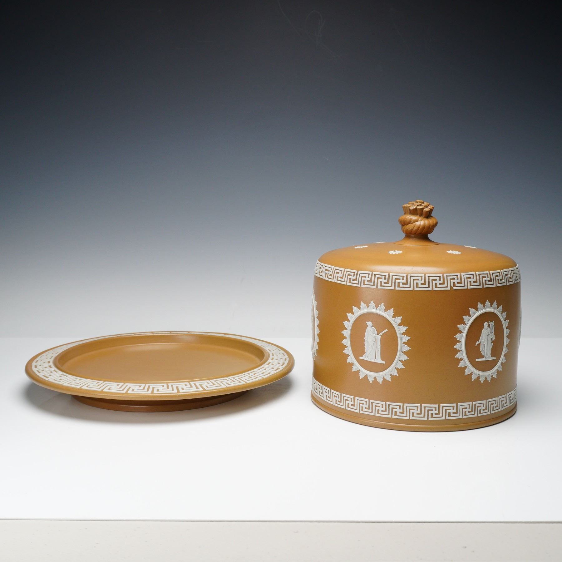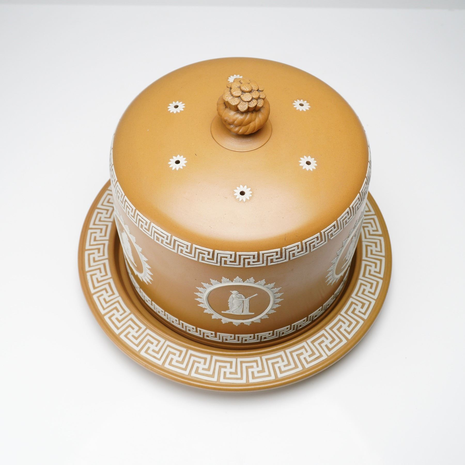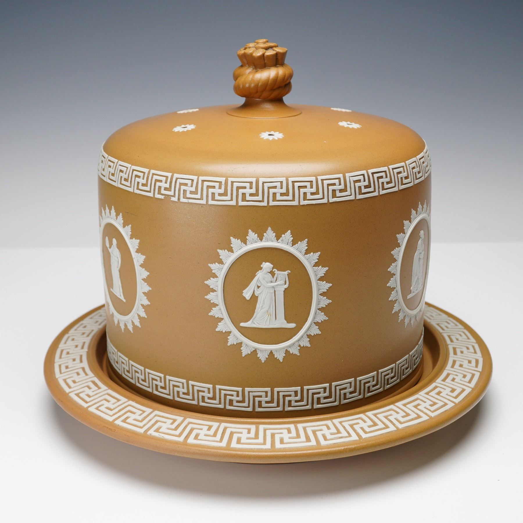 English jasperware cheese dome and underplate by Adams (Tunstall), in ochre-tan ground with applied white sprigged Neoclassical medallions and daisy florets, Greek-key meander borders to the rim and base, and a rope-twist knop finial. The interior of the dome shows ventilation piercings; matching charger with broad Greek key border band as shown. Elegant late 19th/early 20th century table service in the classic Adams interpretation of jasperware.