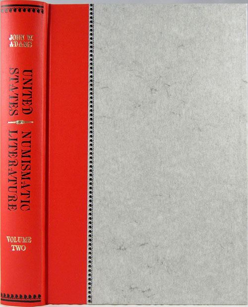 Adams, John W. UNITED STATES NUMISMATIC LITERATURE. VOLUME II: TWENTIETH CENTURY AUCTION CATALOGS. Crestline, California: G.F. Kolbe, 1990. 4to, red cloth and boards, lettered and decorated in gilt and black; page edges speckled; printed throughout in red and black. Frontispiece; 418, (2) pages; 21 additional plates; pictorial endpapers. Fine. One of 500 copies printed, bound by hand and printed on acid free paper. The follow-up to the above volume, tracking those catalogues issued by houses starting life in the first half of the 20th century. Voted as one of the Numismatic Bibliomania Society's "One Hundred Greatest Items of United States Numismatic Literature."