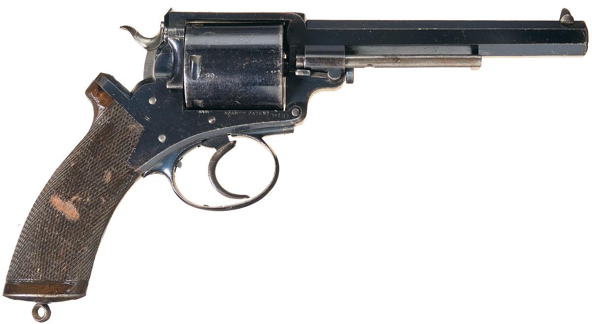 Manufactured circa 1870s. Blade front sight and notch rear sight. The top barrel flat is marked "ADAMS'S PATENT SMALL ARMS Co., 391, STRAND, LONDON." The right side of the frame has the Adams's patent marking and AJ trademark. Alternating "crown/V" and "crown/GP" British proofs appear on the cylinder between the chambers at the rear. Fitted with an ejector rod and one piece checkered grip with lanyard stud on the butt. Matching serial number on cylinder, trigger guard and frame.