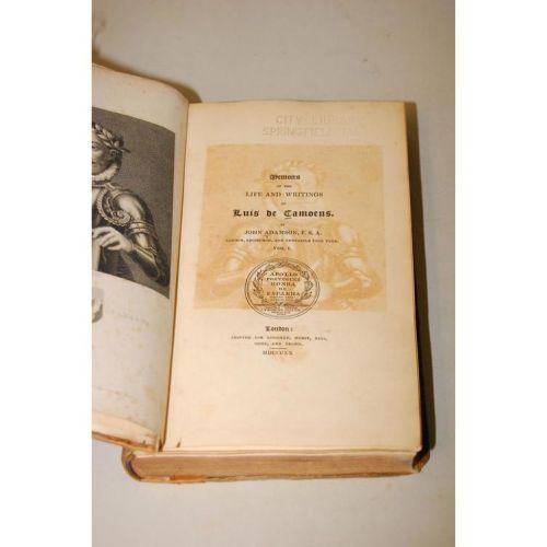 Adamson, John. Memoirs of the Life and Writings of Luis De Camoens - 2 Volumes. London: Longman, Hurst, Rees, Orme and Brown, 1820. 8vo - over 7¾" - 9¾" tall. Hard Cover. Ex-Library. Fair to Good Condition. SCARCE. Frontis in each volume, plus 3 additional plates (one folding). xiv, [2] 310pp; 392pp. Vol I bound in 3/4 leather & marbled paper, with gilt decorated spine, front cover & 1st signature detached, covers worn & peeling. Vol. II in a library binding, with binding & hinges tight. Occasional foxing.