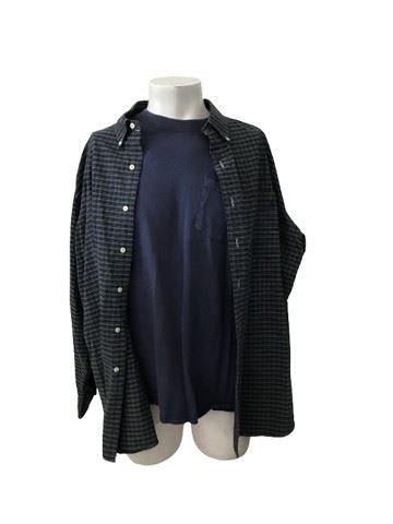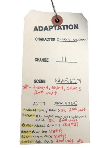 Adaptation Donald (Nick Cage) screen worn, purple/blue/yellow/black plaid "Ralph Lauren" dress shirt (xl) and navy blue short sleeve Hanes crew neck shirt (xl). Includes studio wardrobe tag featuring the scenes it was used in (scene 63, 65, 67 and 74. Wardrobe tag states "2nd unit" which means the costume was used in a reshoot for the film before it was released in theaters.