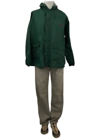 Adaptation. (2002) - John (Chris Cooper) screen worn, green raincoat with a Jansport logo on the front chest, light beige colored Levi's jeans (34 x 34). Also includes a pair of Reebok production soiled, white with blue trim sneakers (size 9).