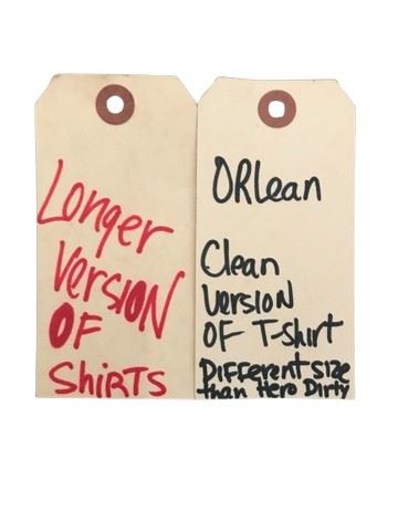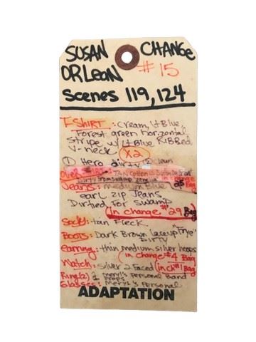 Adaptation. Orlean's (Meryl Streep) clean version of a long sleeve cotton v-neck t-shirt with white blue green and cream horizontal stripes. Includes a wardrobe tag from the production showcasing which scenes this shirt was seen in. This is the clean version of the shirt that becomes dirty during this scene. Includes three other wardrobe tags detailing information about this shirt.
