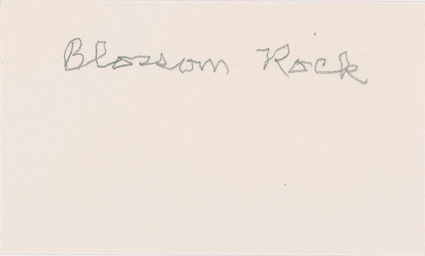 Scarce pencil signature, "Blossom Rock,” on an off-white 5 x 3 card. In very fine condition.