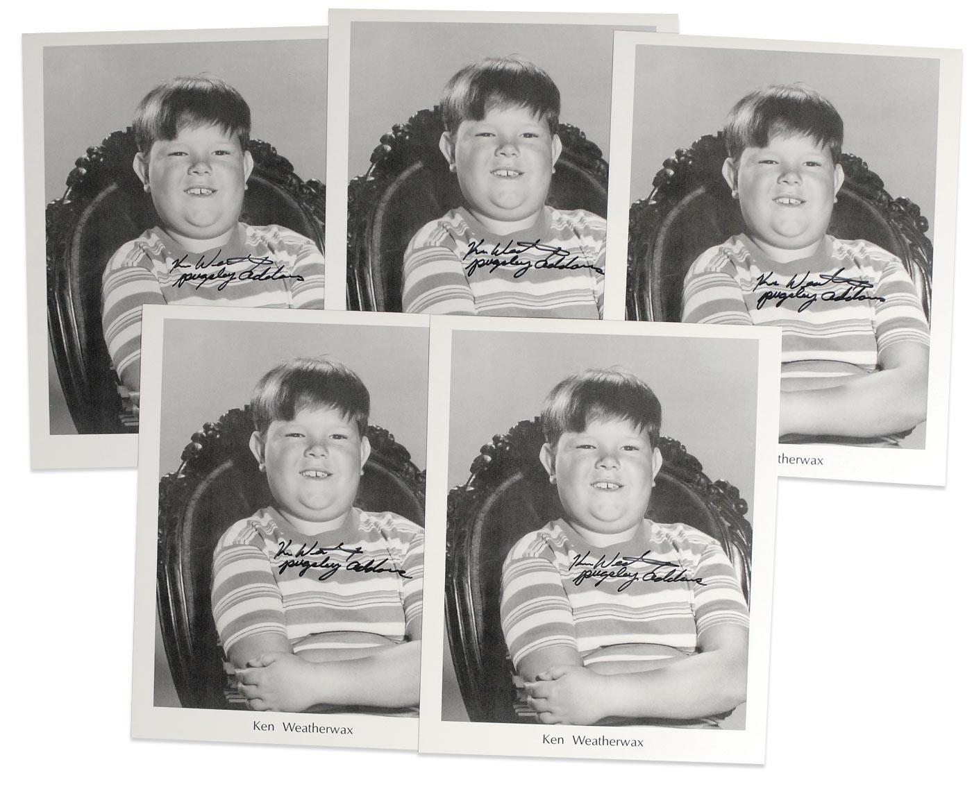 Five identical 8 x 10 cardstock photos of Weatherwax in character, each signed in black felt tip “Ken Weatherwax, Pugsley Addams.” In overall fine condition.