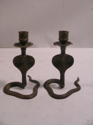 These are two candlestick holders that were used as background props in the television series, 'The Addams Family' (1964-1966), a sitcom starring Carolyn Jones and John Astin that followed the mishaps of a creepy and spooky family. The holders are made out of brass, and are fashioned to look like cobras, with the actual candleholder placed on top of their heads. There are various engravings of leaves and flowers along the snake's body and on the holder. (Measures approx. 3.75" x 4.5" x 6" ea.)