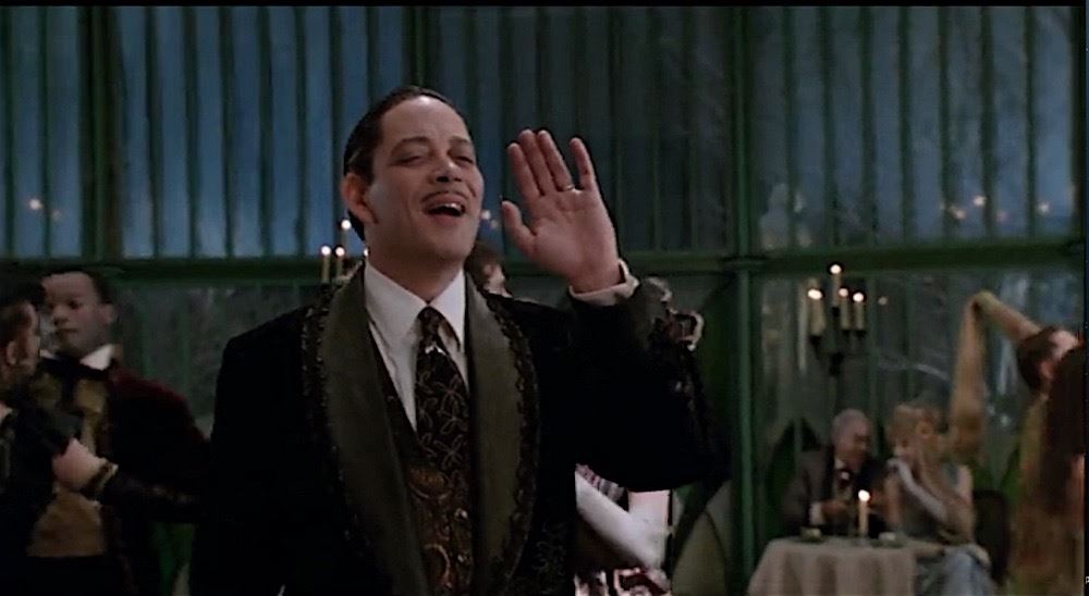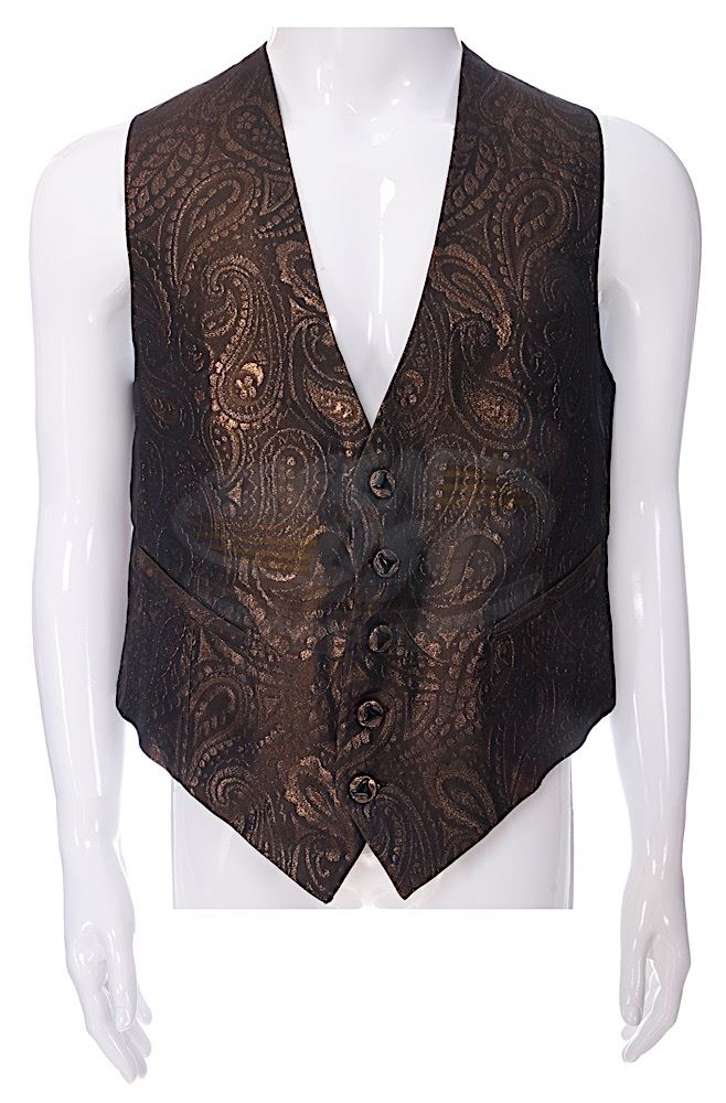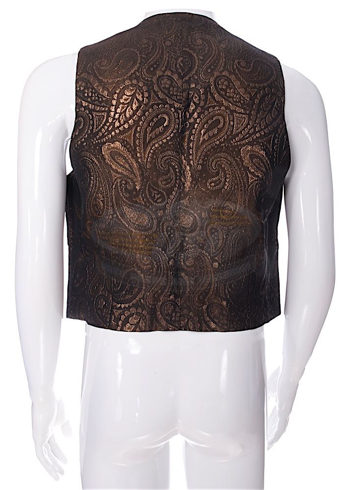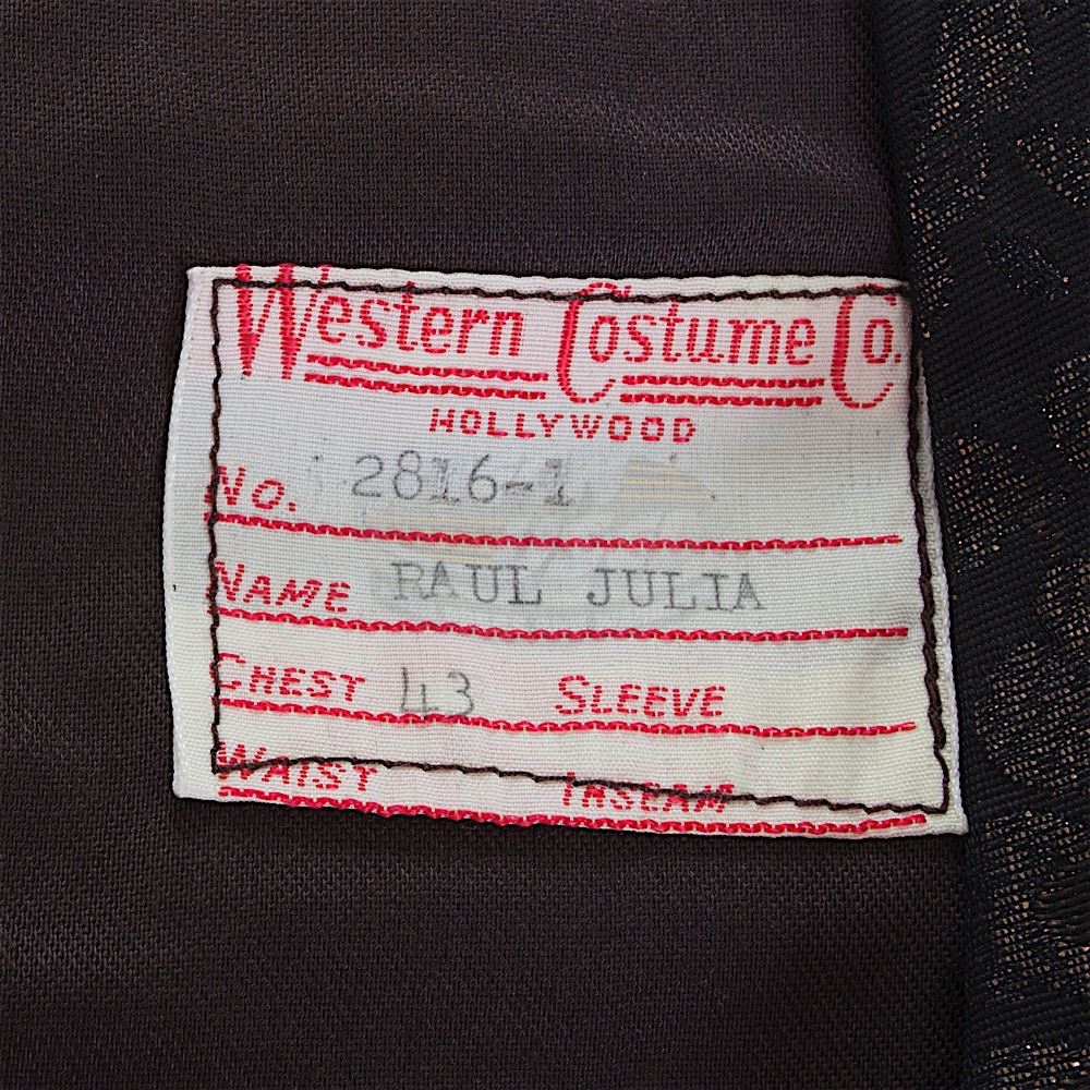 (Orion Pictures, 1991) This vest was custom-made by the production for use by the late Raul Julia as "Gomez". The vest can be seen during the party for Uncle Fester. The vest features a Western Costume tag sewn into the vest with "Raul Julia" typed onto it.
