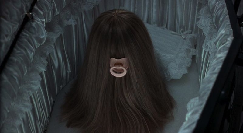 (Paramount, 1993) Baby What puppet (the infant son of Cousin Itt) featuring fine long blondish-tan flowing hair (perhaps yak) and the pacifier that he once sucked in "Addams Family Values". Designed by and acquired from Mr. Tony Gardener of Alterian Studios.