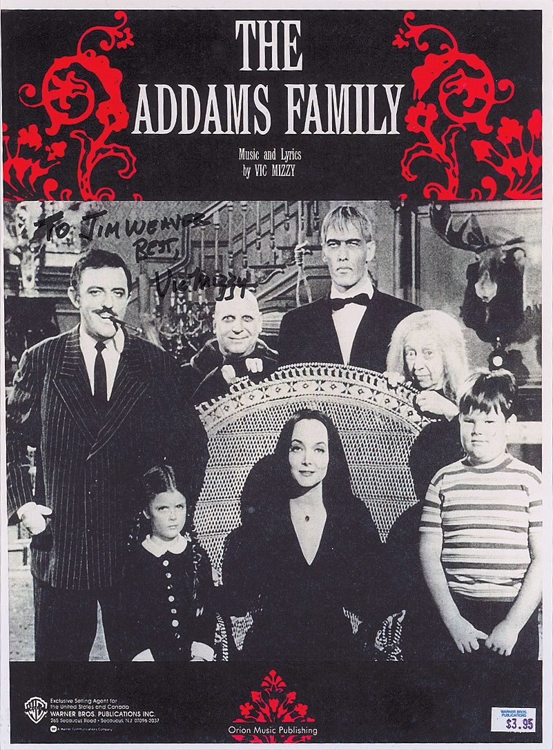 Longtime Hollywood composer (1916-2009) whose best-known works are the themes to the 1960s television sitcoms Green Acres and The Addams Family. Color copy of the sheet music cover for the theme from The Addams Family, 8.25 x 11, signed and inscribed in black felt tip, “To Jim Weaver, Best, Vic Mizzy.” In fine condition.