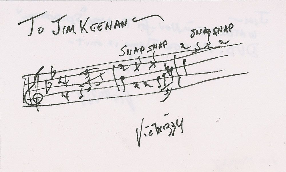 AMQS on an off-white 5 x 2 card, signed and inscribed in black felt tip, “To Jim Keenan—Vic Mizzy.” Mizzy pens the first three bars of the Addams Family theme, snaps included. In fine condition.