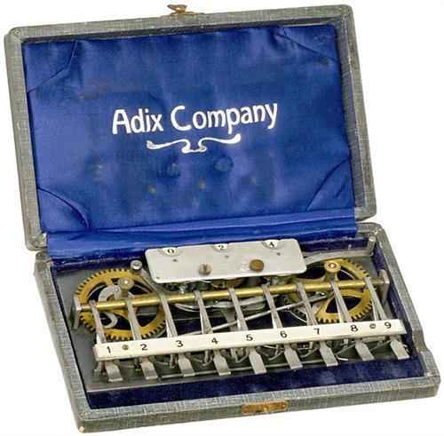 "Adix Mod. 3", 1903 Attractive 3-digit adding machine with 9 keys, in original velvet case! - Very sought-after collector's item!<Br>