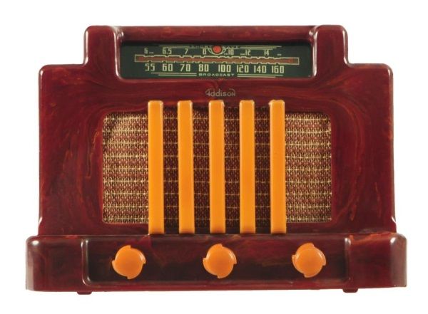 Original Addison Model 5 Radio. In very good original, working condition. Lights up & good sound. Deep color & marbling in the bakelite case. Circa 1940-47. Measures 12 1/2" wide, 7" deep, 9" tall.