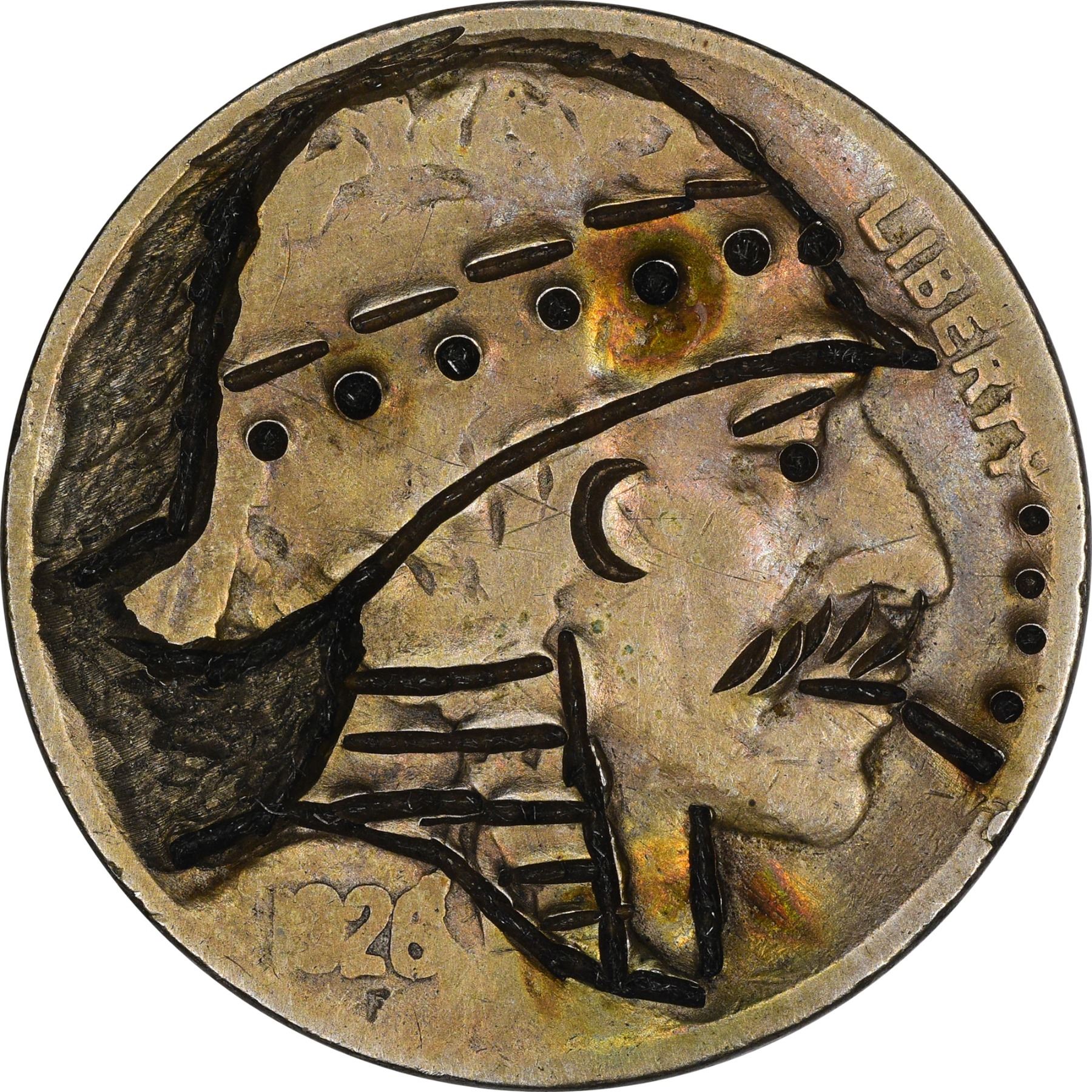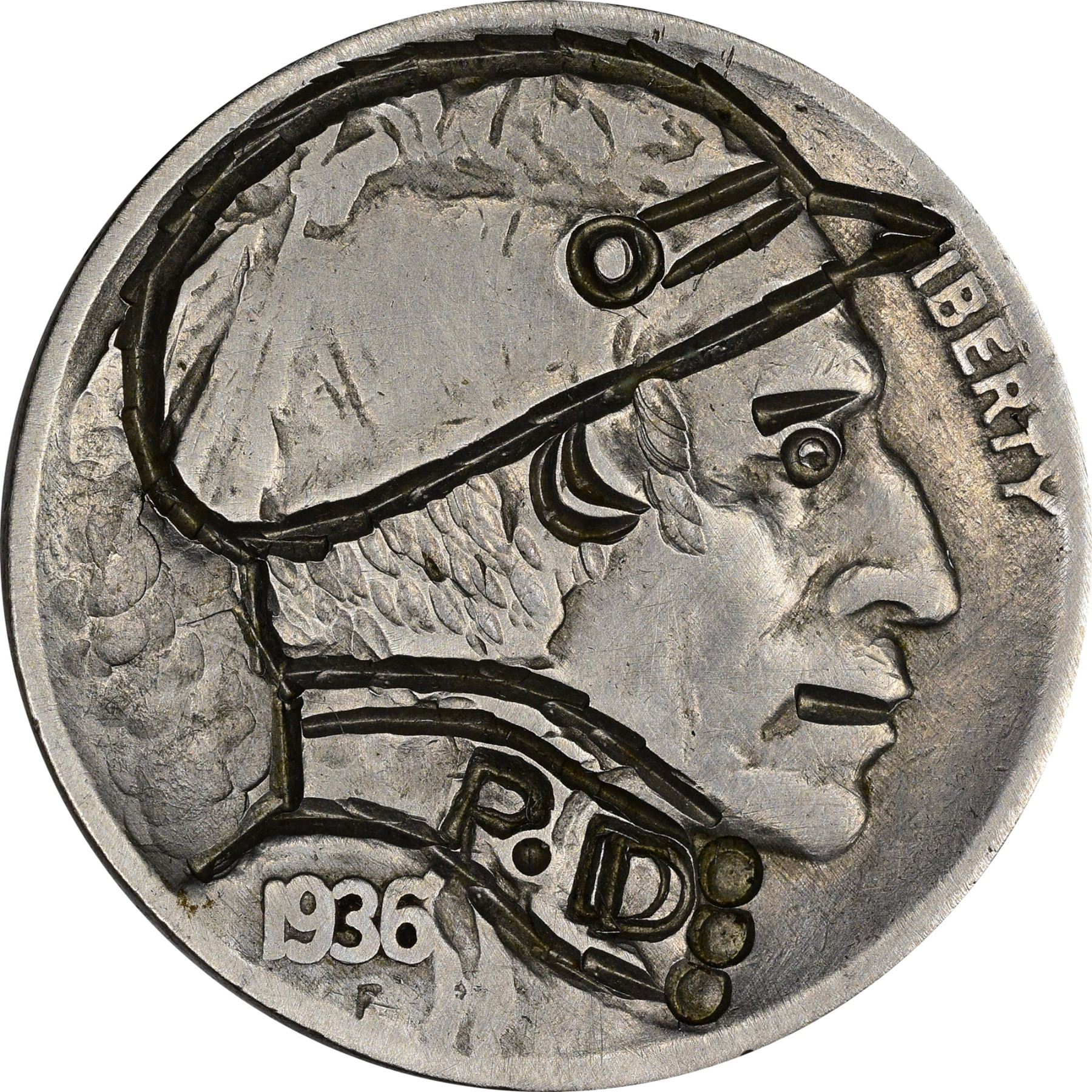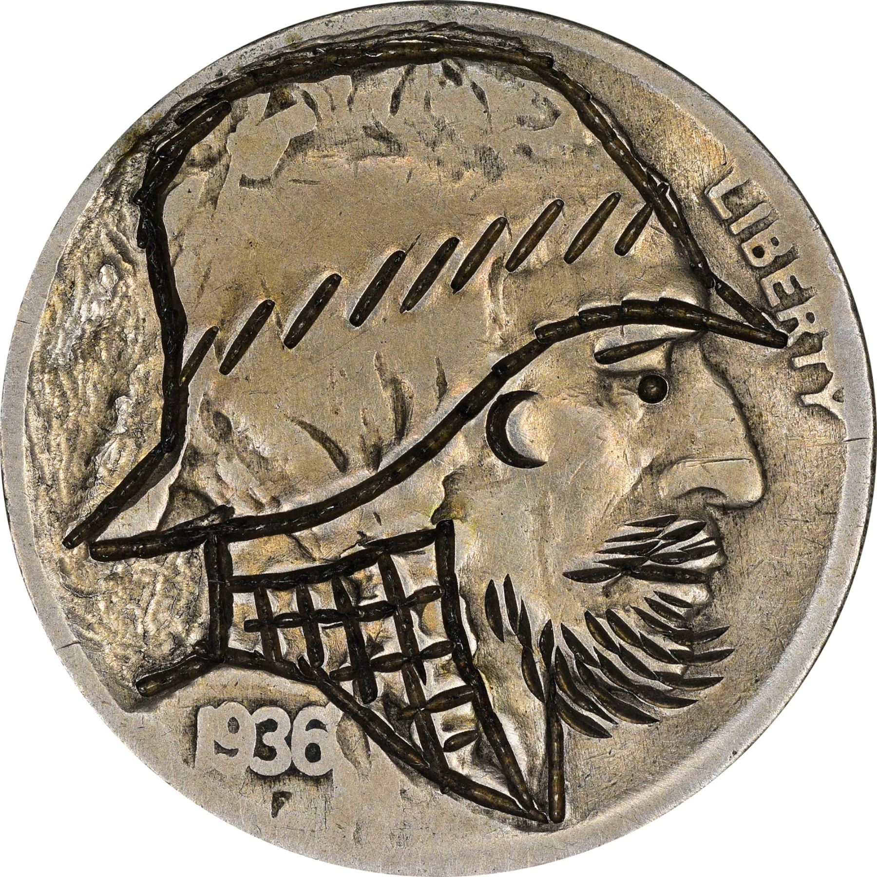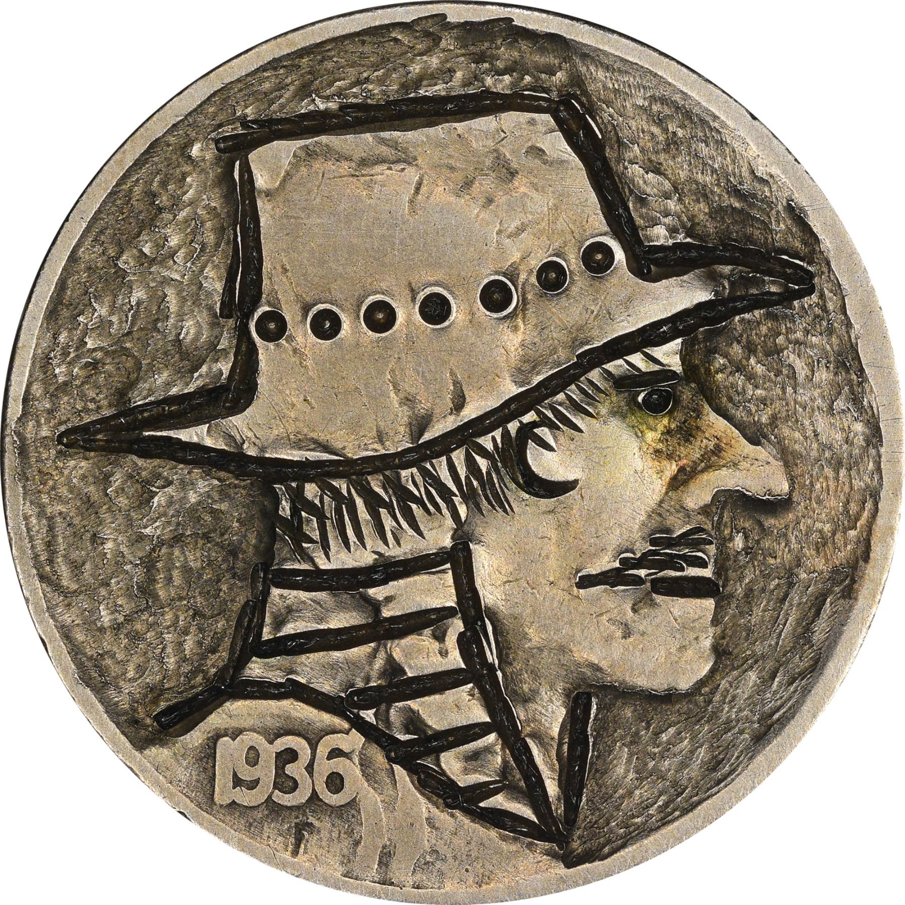 Description: An opportunnity to obtain pieces done by the female carver Jackie Allen and specimens that include J. Press carvings. John Press (also known as Jack Press or J. Press) carved in the late 1980's and taught Jackie Allen in the art of carving hobo nickels (Total: 12 coins)