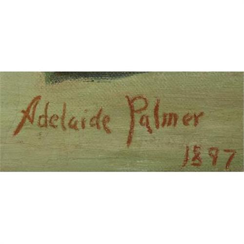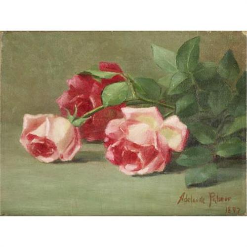 <B>Attributed to ADELAIDE PALMER (American, 1851-1928)</B></I><BR><I>Roses</B></I>, 1897<BR>Oil on canvas<BR>12-1/8 x 9-1/8 inches (30.8 x 23.2 cm)<BR>Signed lower right: <I>Adelaide Palmer</B></I><BR> <B>Condition Report:</B> Normal wear commensurate with age, some craquelure and wear to the edges, unframed<BR><BR><b>Shipping:</b> Framed - without Glass, Small (<a target="_blank" href="http://www.heritageauctions.com/common/shipping.php">view shipping information</a>)