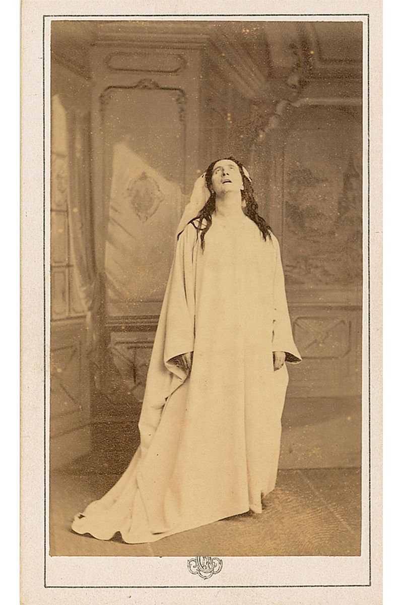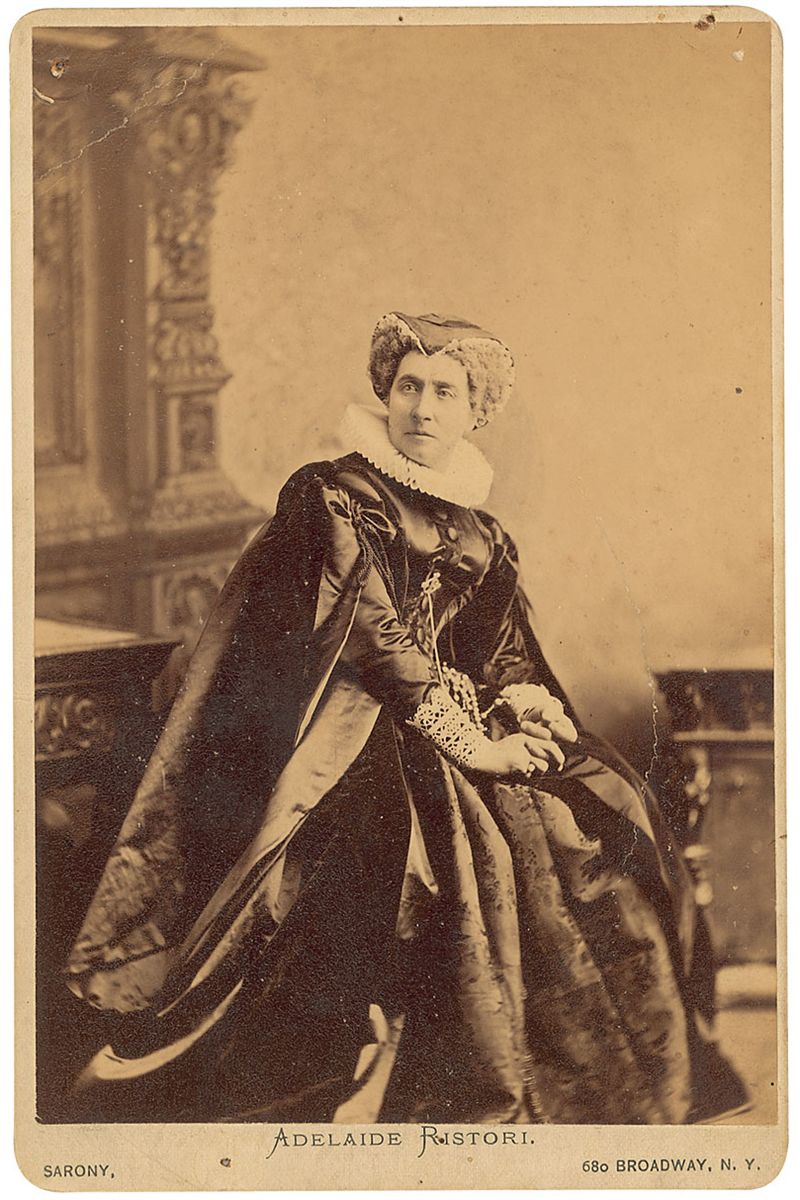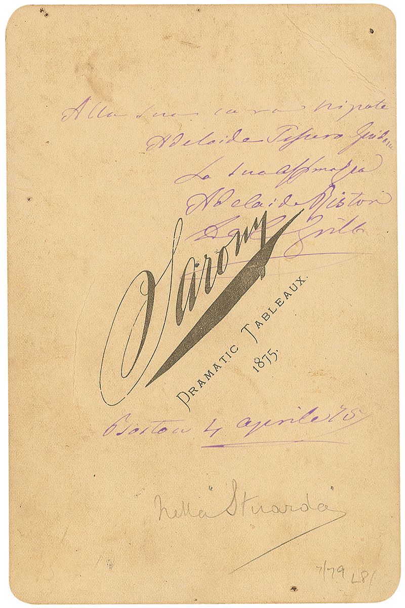 Italian actress (1822–1906) known for her appearances in tragedies. Original 4.25 x 6.5 cabinet photo by Sarony of New York, signed and inscribed on the reverse in Italian in purple ink, and dated April 4, 1875. In very good condition, with a crease to the upper left corner, various tack holes to corners and borders, and scattered soiling to reverse. Accompanied by an unsigned original carte-de-visite portrait of Ristori.