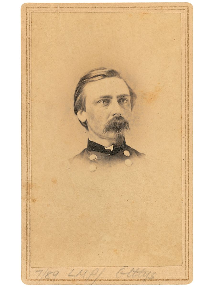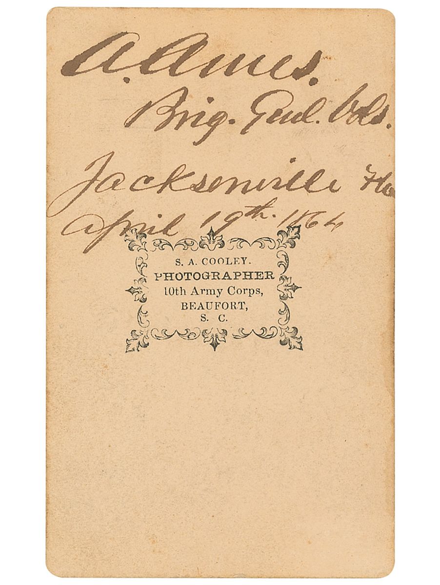 Union general and Medal of Honor recipient. Ames was the last general officer of the Civil War from either side to die, passing away at 93 years of age in 1933. Original 2.25 x 4 carte-de-visite photo by S. A. Cooley of Beaufort, South Carolina, signed on the reverse in black ink, “A. Ames, Brig Genl Vols, Jacksonville, Fla, April 19th 1864.” In very good condition, with pencil notations to bottom border, some light creases, and some light toning and foxing to both sides.