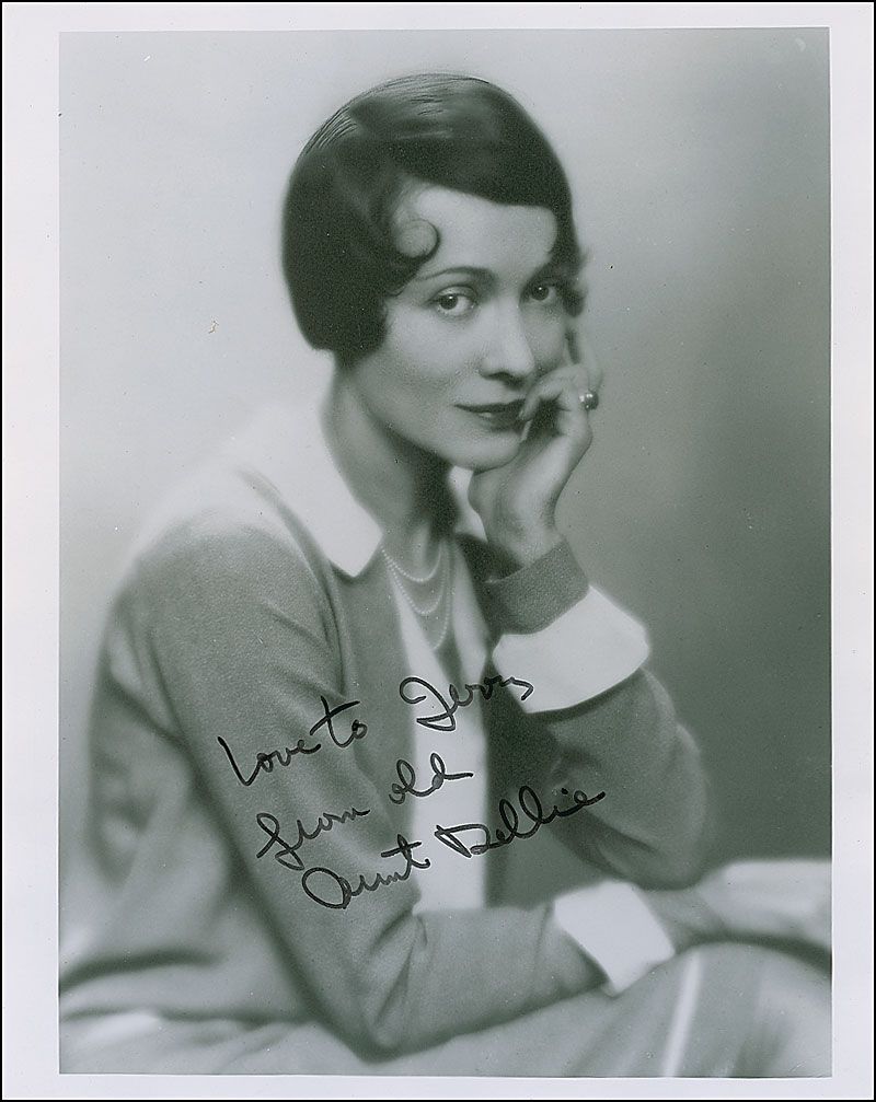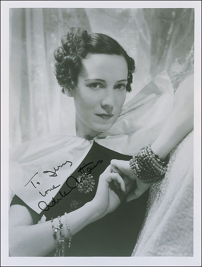 Two different cardstock 8 x 10s, one featuring Adele in a flamboyant collar and jewelry, signed and inscribed in black felt tip, “To Jerry, Love Adele Astaire,” and the other picturing her in more refined attire, signed and inscribed in black felt tip, “Love to Jerry, from old Aunt Dellie.” In fine condition, with light rippling to the edges of both images.