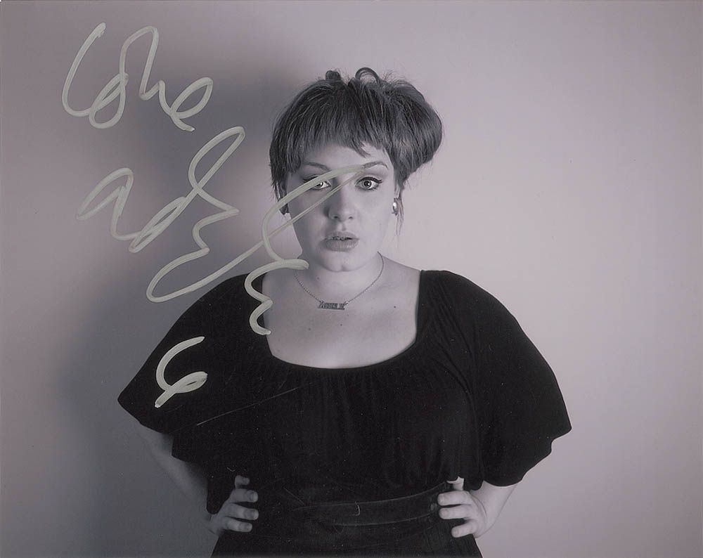 Satin-finish 10 x 8 photo of the singer with her hands on her hips, signed in silver ink, “Love, Adele.” In fine condition.