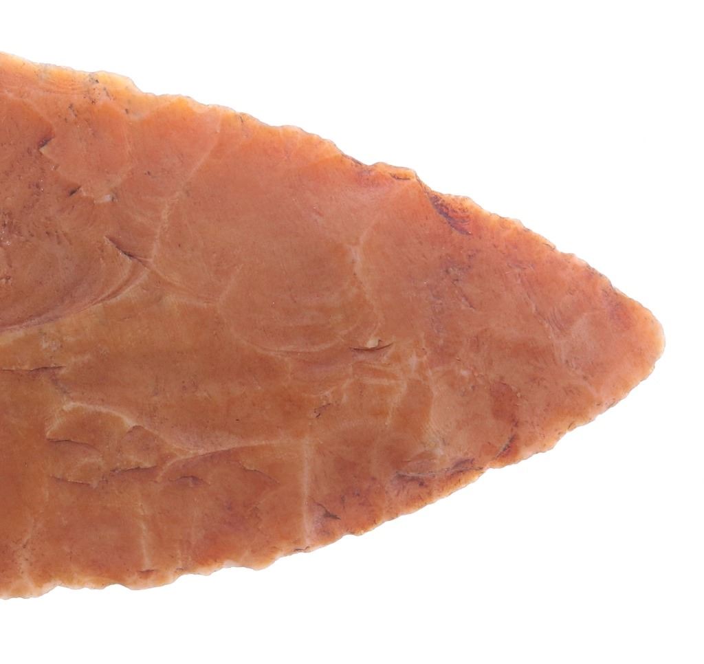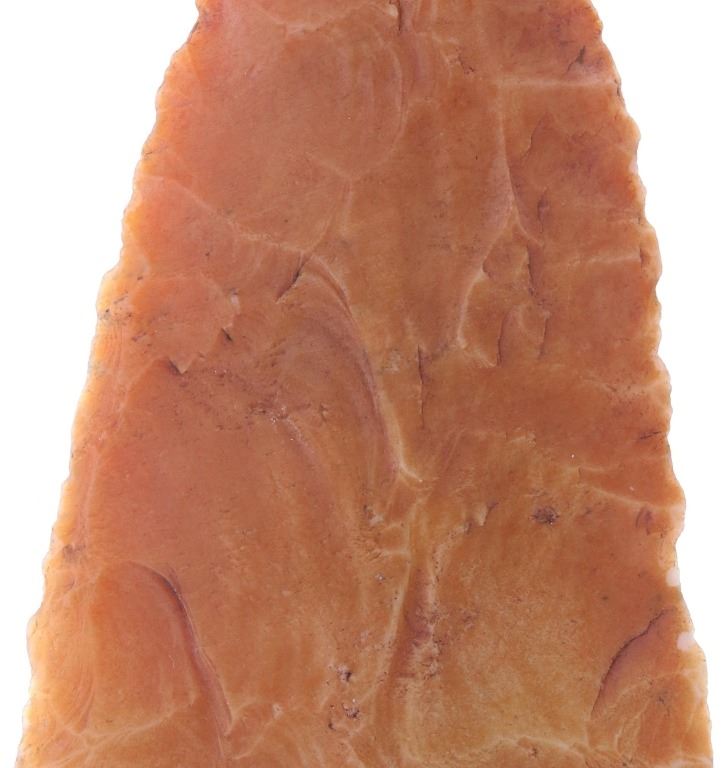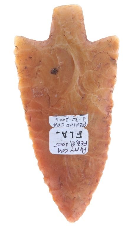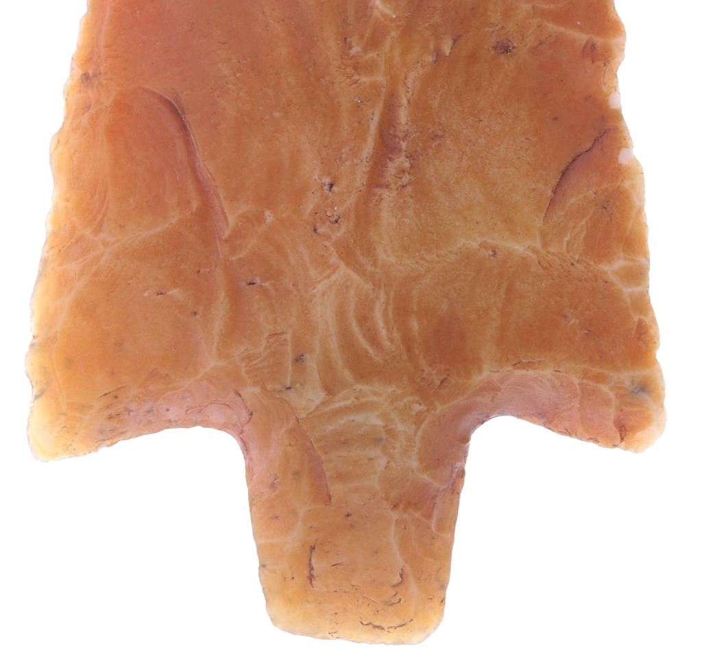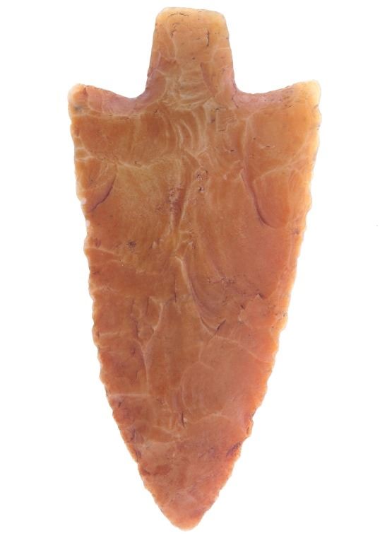 Featured in this lot is this Adena Robbins stemmed cluster point from the Early Woodland Period and aged from 2,500 - 1,500 B.P. This point is a broad, medium size, triangular point with a broad blade and excurvate. It shows a nearly straight stem and is knapped from a bronze to light brown chert material. The condition of this point is good, with no obvious signs of damage. The measurements of this point are 4 1/8" x 2 1/8" x 1/4". Provenance: originally from the Putty private Florida collection and passed to the Perino private collection.