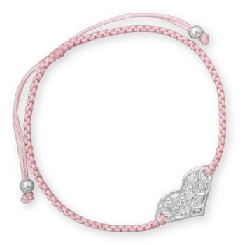 Adjustable woven pink cord bracelet with sterling silver cut out heart. The large cut out heart has 7 smaller hearts with 1.5mm CZs. The large heart is approximately 11mm x 19mm. .925 Sterling Silver