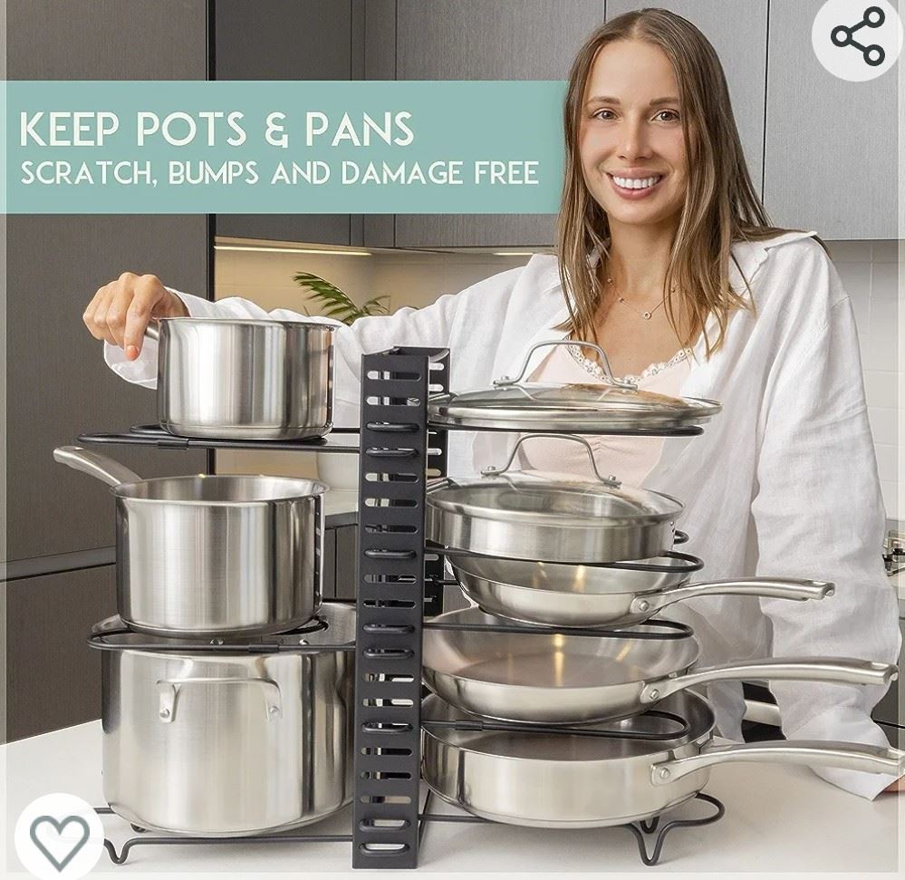 Stackable pot and pan kitchen organizer, protects cookware from damage, black, new.