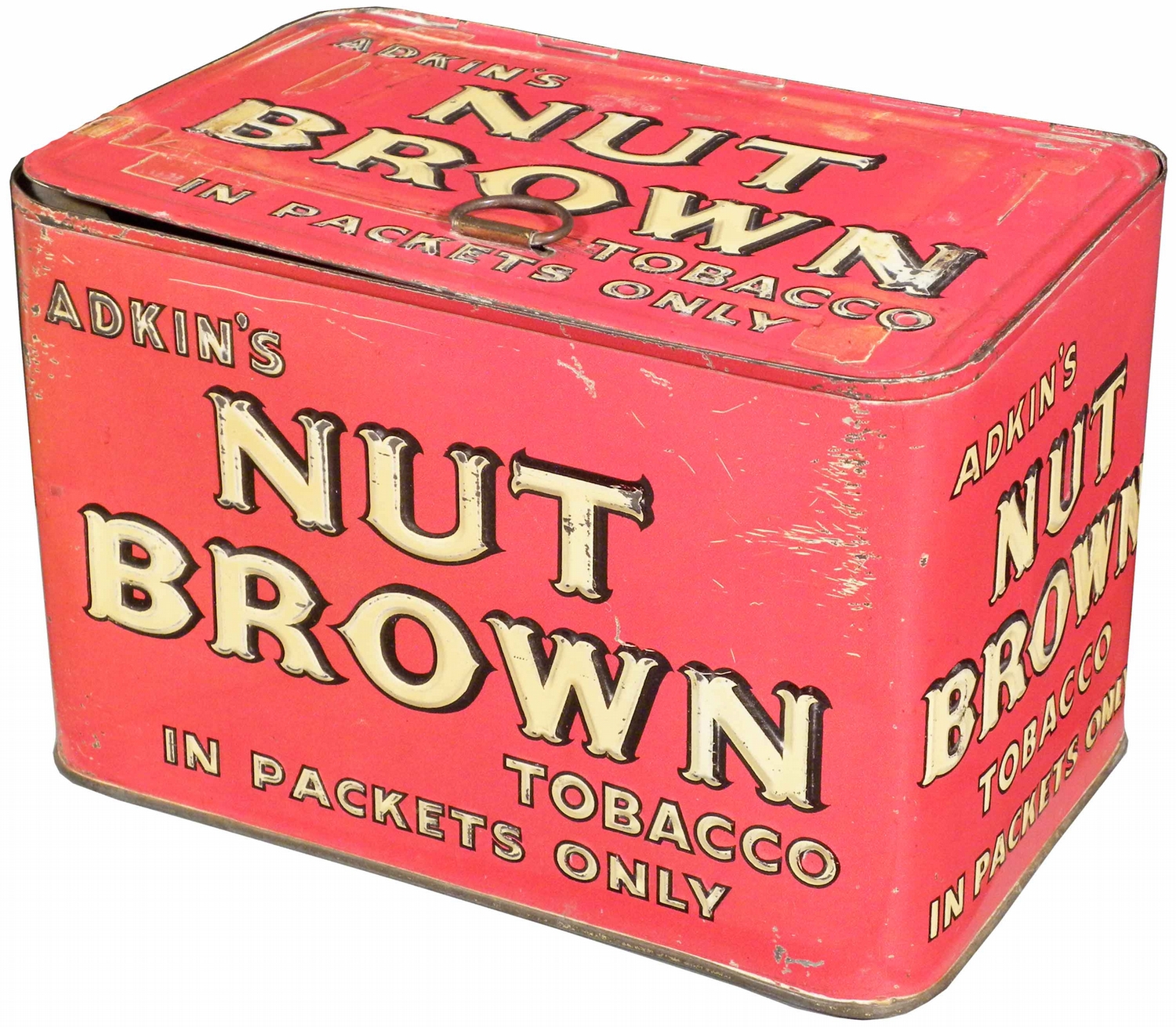 Adkin's Nut Brown Embossed Tobacco Store Bin. Very good condition. 8 1/4 X 5 1/2 X 5 1/2 inches.