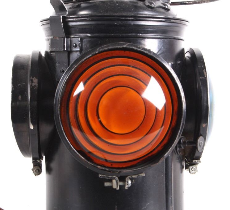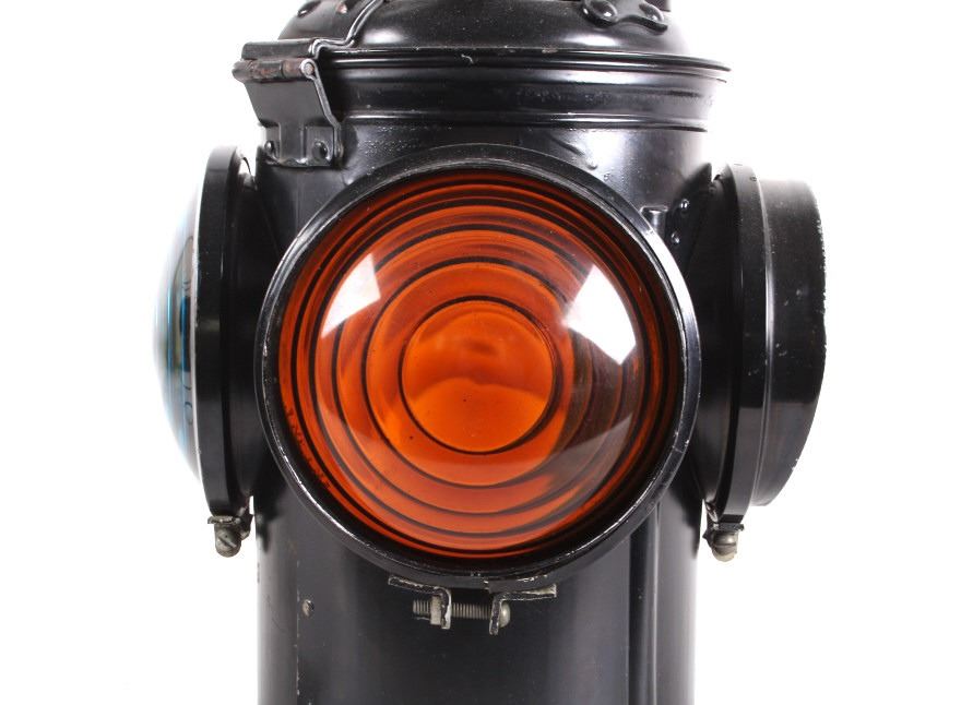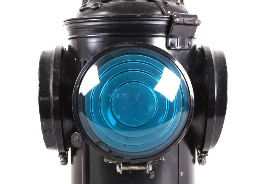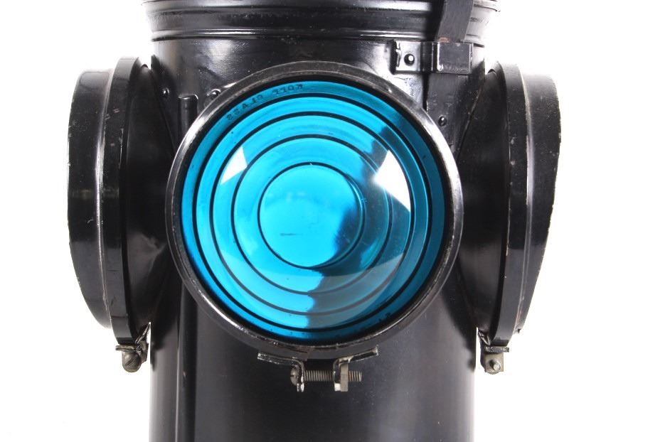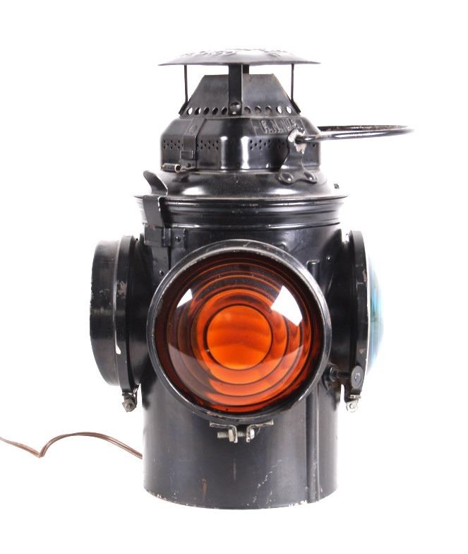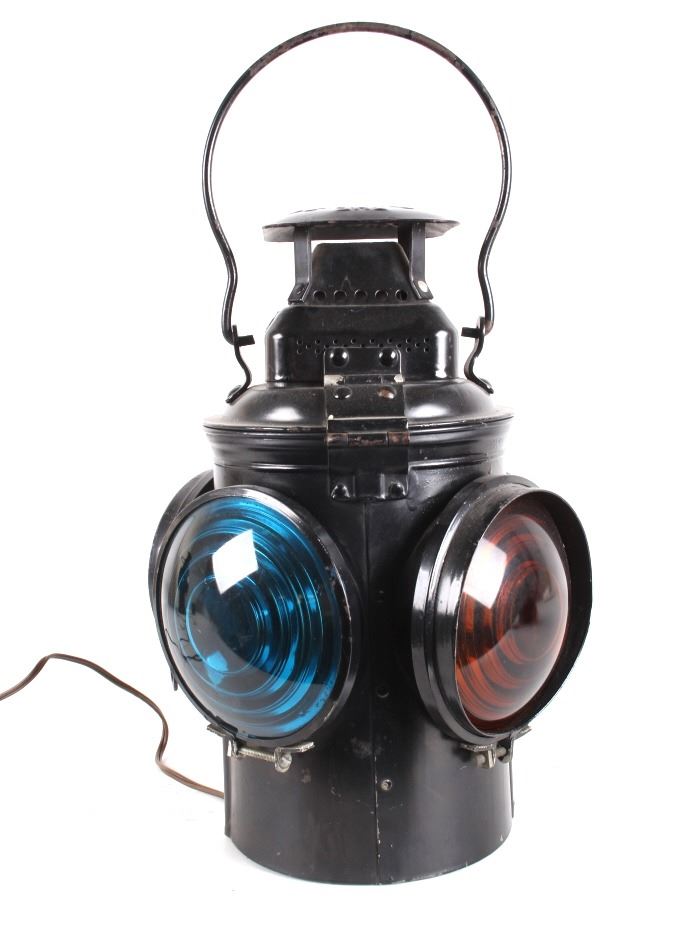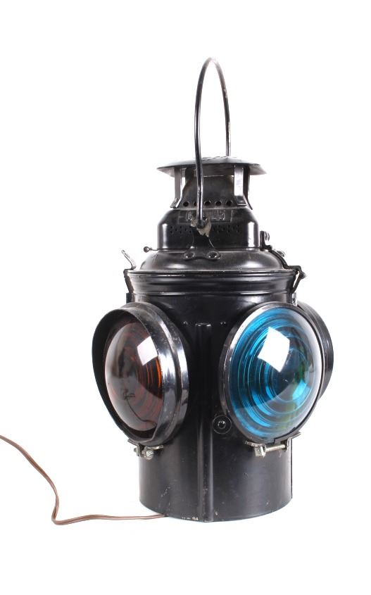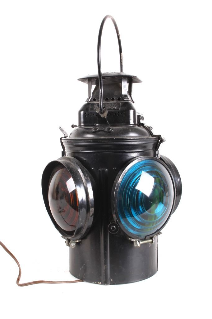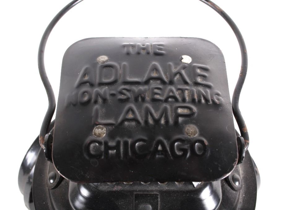 This lot features an antique Adlake non-sweating railroad lamp. Adlake or Adams & Westlake was founded in 1857 in Chicago, Illinois. In the beginning, the company manufactured and sold railroad supplies and hardware. With the opening of the American West and expansion of the railroads, the company prospered and diversified. “Adlake” became one of the largest suppliers of equipment to the transportation industry in the world. The lamp is marked Chicago most likely indicating it was manufacture before the companies move to Indiana in 1927. The lantern has been converted to electricity and lights ups. The lantern features four lenses, two blue and two yellow. The overall condition of the piece is good for its age. Measures: 14" H x 8" D