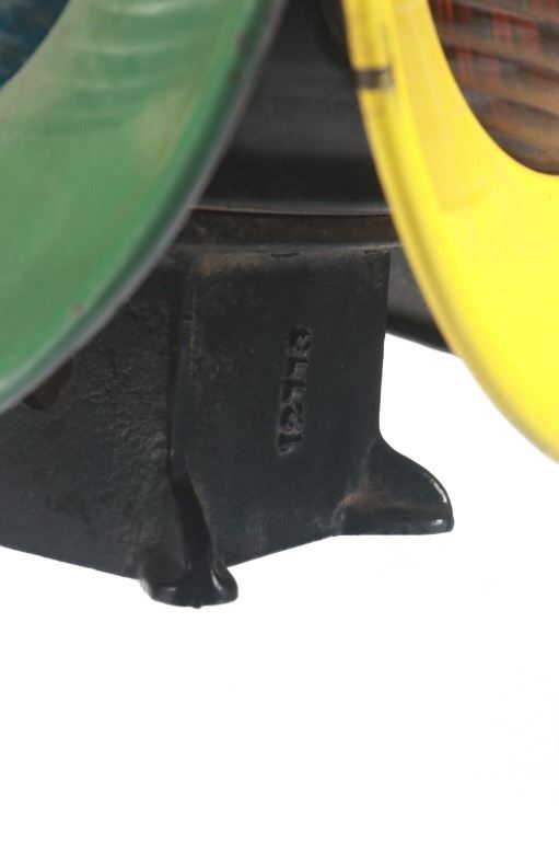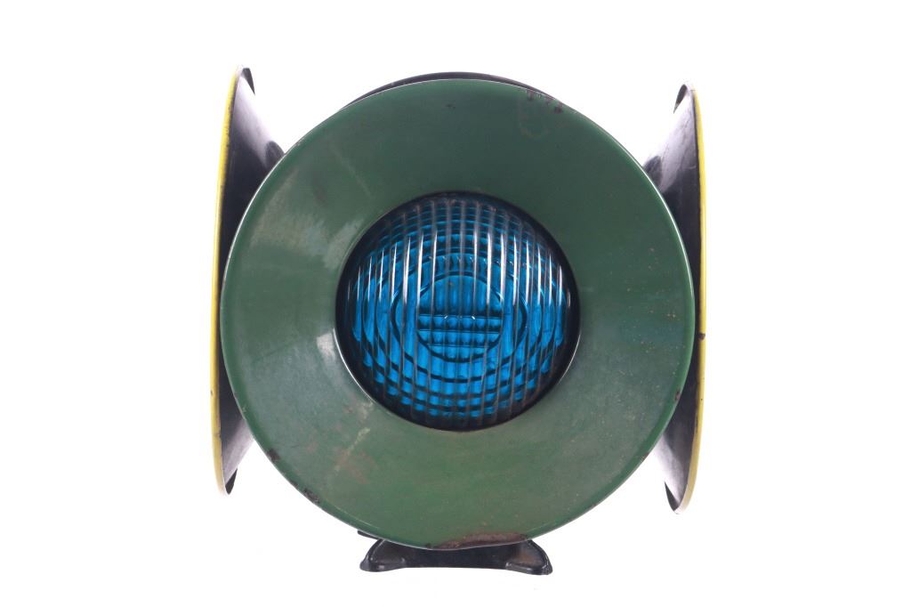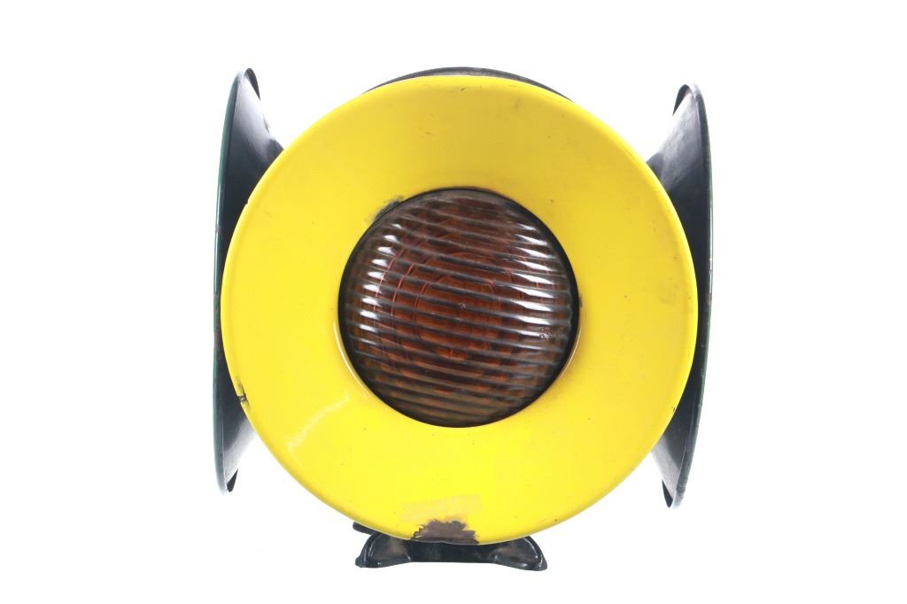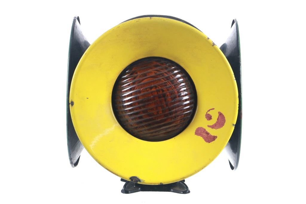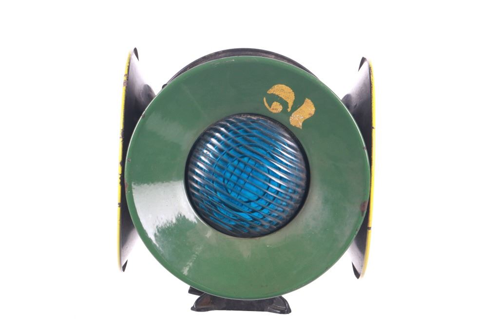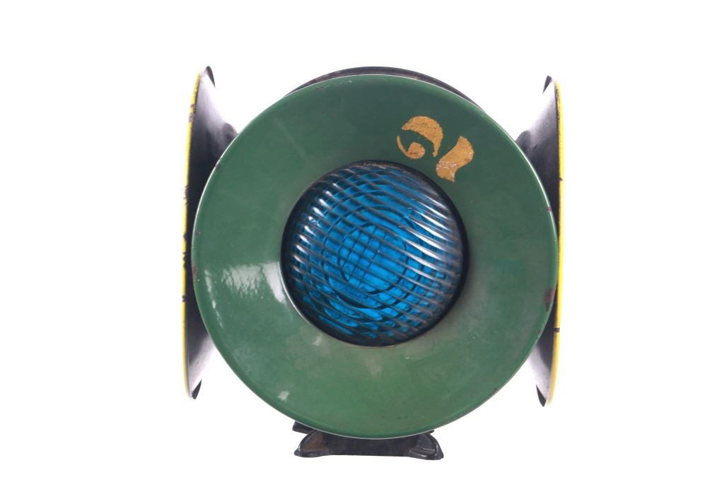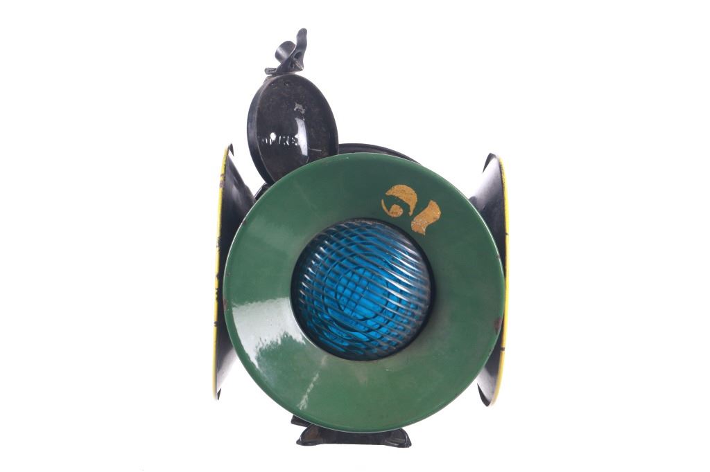 Featured in this lot is this early, Adlake Railroad Lineman or Switch lantern from the Northern Pacific Railroad. The piece is marked on the top in embossed lettering, "Adlake" and shows enamel lens shields in yellow and green. The piece has all the glass lens in and are colored blue and orange. The piece is not marked Northern Pacific, but was originally from a notable private Montana Railroad collection. The kerosene internal lamp is not present. It shows good condition overall with slight wear present from its age and use over the years, but no major signs of damage is noted. It measures 10 3/8" L x 10 3/8" W x 11 1/8" H and weighs 11 pounds and 2 ounces.