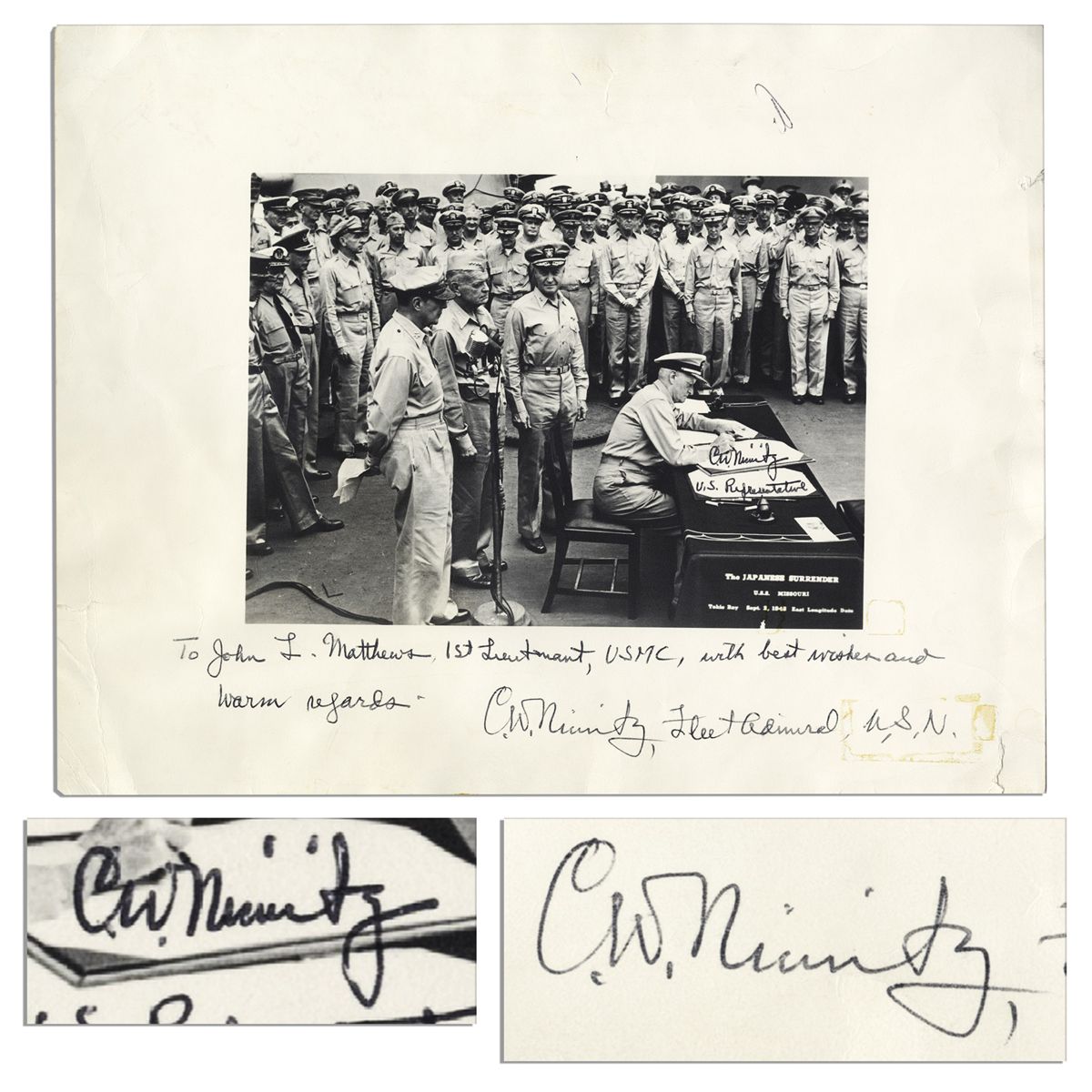 Large 14'' x 11'' photo of the Japanese surrender aboard the U.S.S. Missouri, twice signed by Admiral Chester Nimitz. Nimitz signs ''C.W. Nimitz, Fleet Admiral, U.S.N.'' on the border of the photo. Iconic image depicts Nimitz signing the Japanese Instrument of Surrender while Admirals Sherman and Halsey, and General Douglas MacArthur look on. Signature is dedicated to one John L. Matthews, 1st Lt., USMC by an unknown hand. The second signature is on the image itself, upon the white Instrument on the desk, ''C.W. Nimitz / U.S. Representative''. Black and white photo with border measures 14'' x 11''. Minor creasing, small tear to left and right edge and tape residue to lower right corner, else near fine.