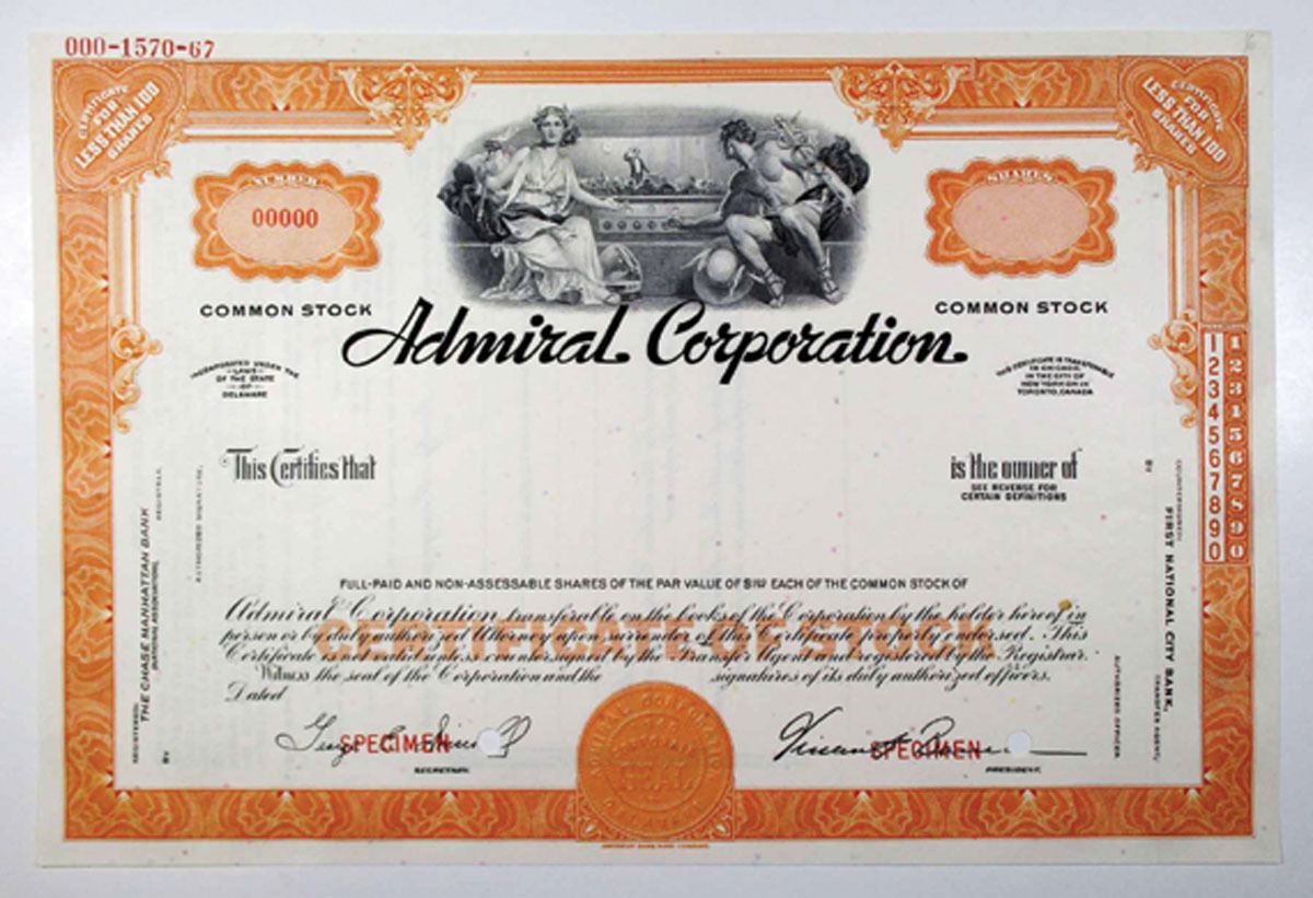 Admiral Corp., 1950s <100 Shrs Specimen Stock Cert., VF-XF ABN Orange. Admiral is an American appliance brand that is currently manufactured by Whirlpool Corporation and sold exclusively at The Home Depot.