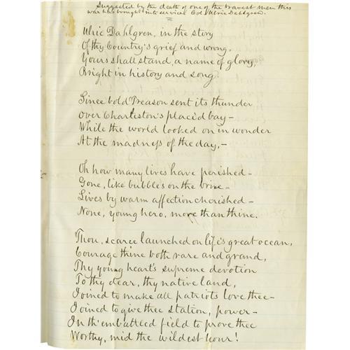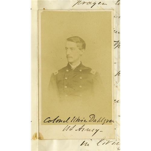 <B>Admiral John Dahlgren Letter to Benjamin French Lamenting the Death of His Son On the Richmond Raid.</B></I> Four pages, 7.75” x 9.75”, Washington, March 18, 1864, in ink, to Benjamin Brown French, with a signed <I>carte de visite</B></I> of Ulrich Dahlgren tipped in, bound with a two page autograph manuscript signed memorial poem to Ulric Dahlgren by Benjamin B. French. This poignant letter expresses the grief of a proud father just two weeks after the death of his son Colonel Ulric Dahlgren on the unsuccessful raid to free Union prisoners of war from Belle Isle prison and to wreck havoc on Confederate installations in Richmond. During the raid, which was approved personally by Abraham Lincoln, Colonel Dahlgren was to dart in, covered by diversions from Generals Custer and Sedgwick and liberate the camp. Unfortunately, on the night of March 2, 1864, as Dahlgren and his force were poised for the raid, he was discovered by a sizable force of Confederates. Although he managed to escape, he was ambushed a second time and killed during the first exchange of fire. His men surrendered shortly thereafter. Papers allegedly found on Dahlgren's body suggested that he intended to sack Richmond and planned on killing Jeff Davis and his cabinet. The text of these documents was published in Confederate newspapers, the publication of which prompted Union General George Meade to send a letter to General Robert E. Lee denying that this had been the purpose of the raid. Many Civil War scholars still consider the raid somewhat of a mystery.<BR><BR>Admiral John A. Dahlgren's letter to Benjamin Brown French, commissioner of public buildings reflects a father's admiration and loss for a beloved son. The letter is a classic example of the patriotic prose of the Civil War era. It reads in part: “<I>Accept my grateful thanks for your note and the lines to the memory of my beloved son, they breathe the true spirit which inspired his own brave heart. It was a part of his high unselfish nature to 'do with his might whatever his hand found to do', and when he undertook the mission of freedom to the weary captives who pined in the Rebel dungeons of Richmond, he did it with a fullness of purpose that know no limit; the danger that lay in the way never palsied his resolve for an instant. His last letter to me, written just before setting out from the camp expresses the conviction that the enterprise 'if successful will be the grandest thing on record' calls it 'a desperate undertaking' and ends thus 'I will write you more fully when we return - if we do not return there is no better place to give up the ghost'. And so he fell, as a gallant soldier of the great cause should fall, at the head of his men…His name should stand in living light before the young men of our land and inspire their hearts with the same unselfish resolution to carry the glorious banner of the Union over the ruins of a causeless Rebellion.</B></I>”<BR><BR>Bound with the letter is a poem inspired by Ulric Dahlgren's death written by B. B. French, dated March 10, 1864 and later published in Admiral Dahlgren's 1872 biography of his son <I>Memoir of Ulric Dahlgren.</B></I> “<I>Sleep, young hero, thou, in dying,/ Fellest in the cause of Right!/ And thy memory, time defying/ Shall be ever-ever bright.</B></I>” This is obviously the first appearance of this original poem and must have moved the elder Dahlgren enough to include it in the book. In gratitude Dahlgren sends French a CDV of his son which is signed in ink “<I>Colonel Uric Dahlgren US Army</B></I>”, presumably by Ulric himself with a postscript in the letter which reads: “<I>The enclosed photograph represents my son just before leaving - not recovered from the effects of losing his leg at Gettysburg </B></I>”. The letter has a chip at the top of the first page that does not affect text, old fold marks, else it is bright, bold and in fine condition. An intimate and historic letter showing the very human side of the war.<BR><BR><b>Shipping:</b> Flat Material, Small (<a target="_blank" href="http://www.heritageauctions.com/common/shipping.php">view shipping information</a>)