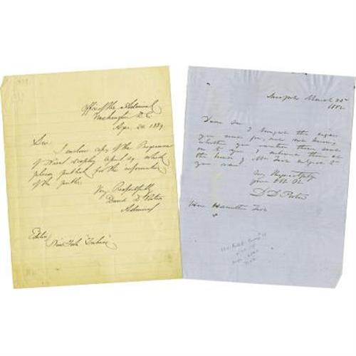 <B>Admiral David Porter Autograph Letters Signed</B></I> “<I>David D. Porter Admiral</B></I>” and “<I>D. D. Porter</B></I>”. A lot of two letters written by Civil War naval hero David Porter including a one page letter, 7.75” x 10”, New York, March 23, 1882, to Hamilton Fish which reads in part: “<I>I have got the cigars you send for, and not knowing whether you wanted them sent on to you I delivered them at the house of Mrs. Fish subject to your order.</B></I>”, also signed on the verso, with the usual fold creases, else very good; and a one page letter, 8” x 10”, Washington, D. C., April 24, 1889, to the editor or the <I>New York Tribune,</B></I> which reads, in part: “<I>I enclose one copy of the Programme sic of Naval Display April 29 which please publish for the information of the public.</B></I>”, with the usual fold creases, else fine. <I>From the collection of Henry E. Luhrs.</B></I><BR><BR><b>Shipping:</b> Flat Material, Small (<a target="_blank" href="http://www.heritageauctions.com/common/shipping.php">view shipping information</a>)