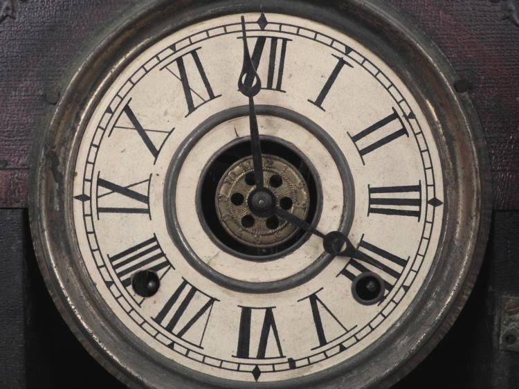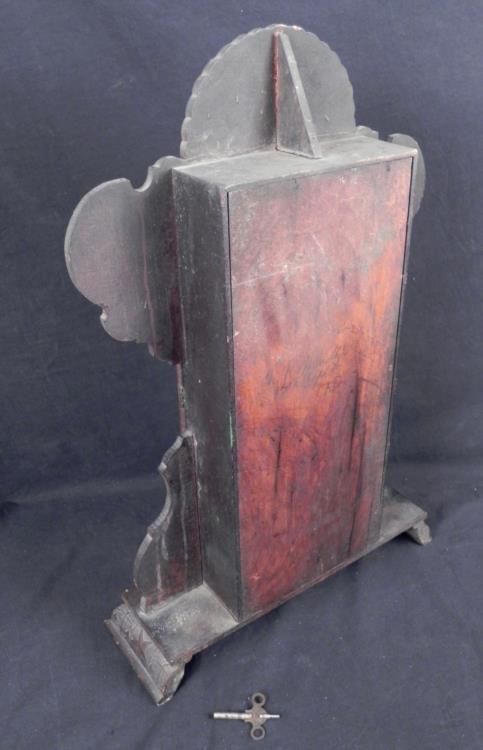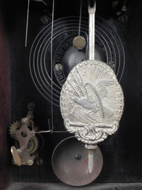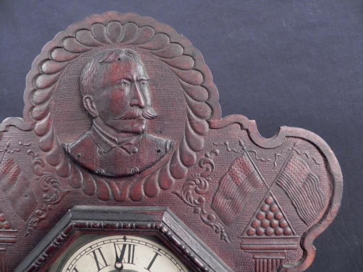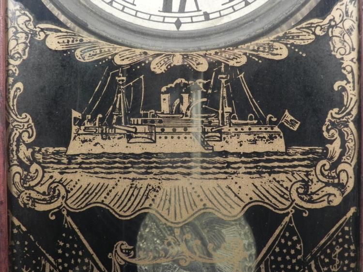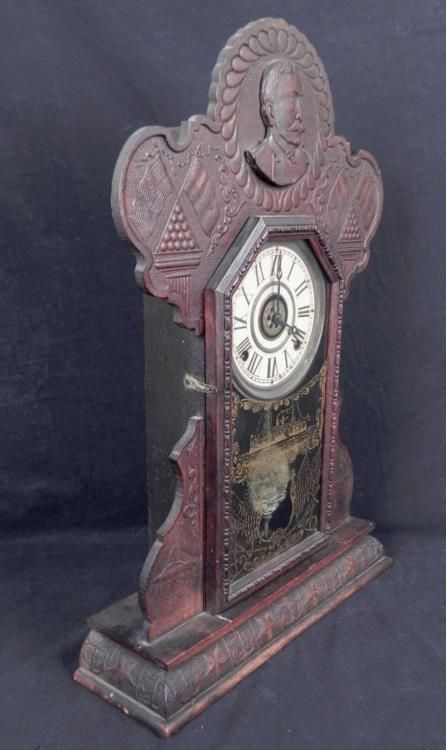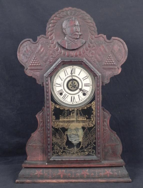 This gingerbread mantel clock was built to commemorate the Spanish American War of 1898, and it highlights its hero, Admiral Dewey. The beatifully constructed oak case is full of wartime symbols, including American flags, stacks of cannonballs, stars and anchors. The pendulum is solid brass. The glass front has a gilt stencilled design to ensure all will remember the Maine, along with waving flags. The clock was made in U.S.A. by E. INGRAHAM around 1898-1902. It features a wind-up alarm that sounds like a buzzer. The movement was running fine when tested. Its dimensions are: Height - 23" , Width - 15" , Depth - 5" * * This clock will be historic for a clock collector, or a splendid piece for a military collector.