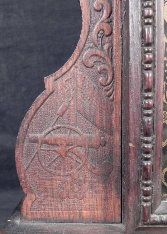 This gingerbread mantel clock was built to commemorate the Spanish American War of 1898, and it highlights its hero, Admiral Dewey. The beatifully constructed oak case is full of wartime symbols, including American flags, stacks of cannonballs, stars and