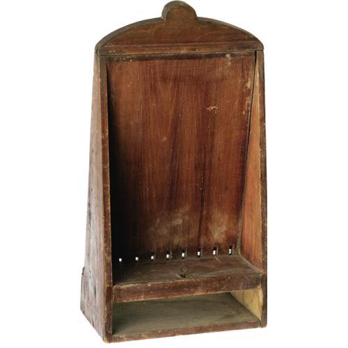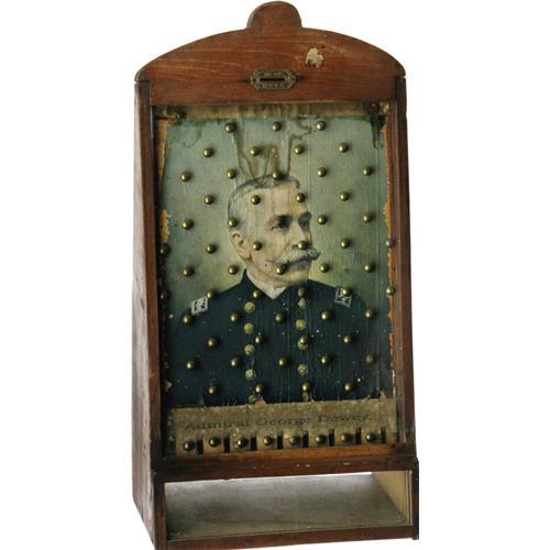 <B>Admiral Dewey Wooden Tabletop Coin Drop Game Circa 1900.</B></I> Offered here is a rarely-seen product manufactured during the "Deweymania" surrounding his impressive naval victory over the Spanish Fleet at Manila during the Spanish-American War. George Dewey was welcomed back to America as a hero and it was even suggested that he run for president in 1900 but he decided not to in favor of McKinley's re-election. This wooden game is 19.5" x 10" x 6.5" (at the base- it slants upward to 1" at the very top). There is a "Drop Here" slot near the top above a 9" x 12" color portrait of "Admiral George Dewey" under a glass window with approximately 63 brass round-headed tacks neatly spaced in rows down to the nine slots at the bottom where the dropped coins would stop. Below that is a clear glass panel covering an area where coins would be visible to the player as an enticement to play. There is a catch in the back which, when pulled, drops the slotted coins into a bottom drawer (not present). This was most likely used as a "bar game" possibly with the players placing bets on which slot their Indian Cents, Barber Dimes, or Liberty Nickels (all available from our Rare Coins division if you desire absolute display accuracy) would eventually land. The condition is very good overall with some dampstaining and deterioration to the Dewey portrait. The original manufacture is a bit rough giving it almost a handmade appearance. An excellent display item from the Spanish-American War era and one that, over time, might even pay for itself!