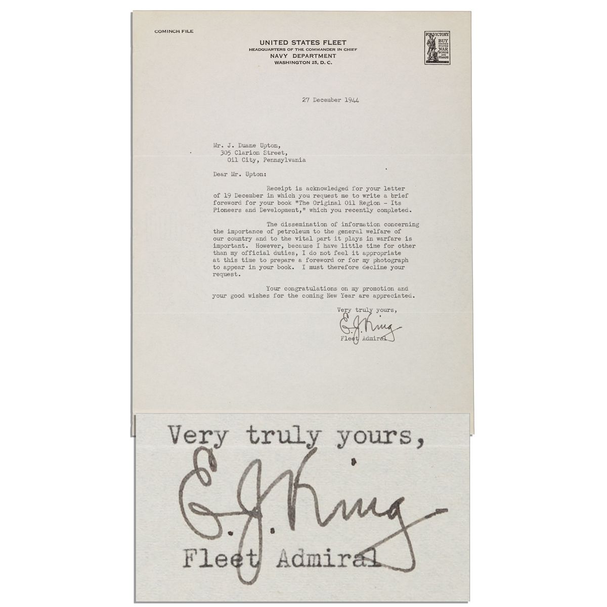 Admiral Ernest J. King typed letter signed during World War II. Dated 27 December 1944 as Fleet Admiral and Chief of Naval Operations, King writes to an author turning down his request to pen a forward to a book on oil. In part ''...The dissemination of information concerning the importance of petroleum to the general welfare of our country and to the vital part it plays in warfare is important. However, because I have little time other than my official duties...I must therefore decline...[signed] E.J. King''. 1pp. on naval U.S. Fleet stationery measures 8'' x 10''. Near fine.
