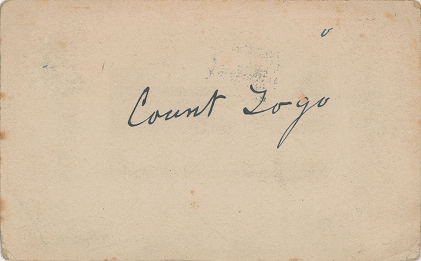 Japanese naval hero (1848-1934) who led his country's fleet to victory in the Russo-Japanese War. Vintage ink signature, "Count Togo,” on the reverse of an off-white 5 x 3.25 postal card with a cancellation date of July 22, 1911. In fine condition, with overall soiling.