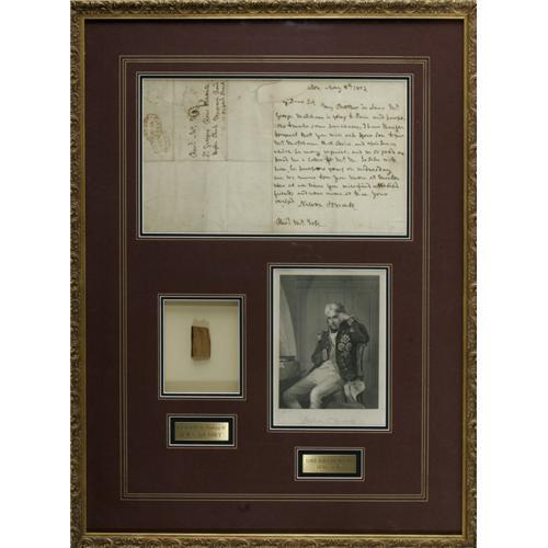 <B>Admiral Lord Horatio Nelson Autograph Letter Signed,</B></I> "<I> Nelson & Bronte</B></I>". One page, 7.25" x 8.5", May 8, 1802, to one Reverend Este, Hyde Park. Nelson's seemingly odd signature here is typical of those he employed during the final years of his life. In 1799 Ferdinand, King of the Two Sicilies and Infante of Spain, granted Nelson a Sicilian duchy Bronte in return for services against the Neapolitans. Becoming a dual citizen of sorts, Nelson proudly advertised his new title along with his English name. The letter reads, "<I>My Dear Sir, My Brother in law Mr. George Matcham is going to Paris and purposes to make some purchases. I have therefore to request that you will ask your son to give Mr. Matcham that advice and assistance which he may require, and be so good as send me a letter for Mr. M to take with him, he purposes going on Wednesday. Are we never to see you more at Weston where at all times you will find attached friends and none more so that your obliged.</B></I>" There is a 1" x 3" area of paper loss removing Nelson's location and touching upon the salutation. Folds, light stains, else Very Good condition. The letter is mounted open in a gilt wooden frame to reveal the address panel. Included are two brass nameplates, a later 19th c. engraved portrait of Nelson and a wood fragment from Nelson's Trafalger flagship, <I>H.M.S. Victory.</B></I> Overall framed size is 31.0" x 23.0". <BR><BR><B>Important no