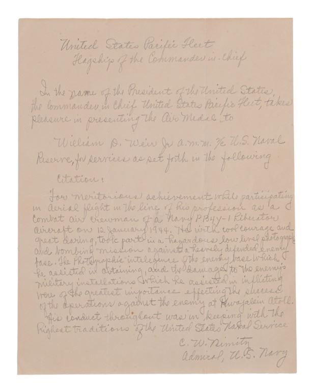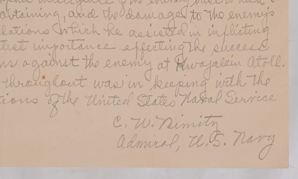 May 1944 war time letter hand written in pencil & signed C.W. Nimitz, Admiral U.S. Navy.