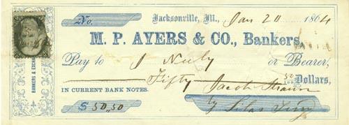 SILAS WRIGHT TERRY. ADS. 1pp. 7 3/4" x 3". Jacksonville, Ill. January 20, 1864. A Civil War dated check signed "Jabob Staun / by Silas Terry". The partly printed "M. P. Ayers & Co., Bankers" check is completed in Terry's hand, and paid "J Neely $50.50". The check has the usual cancellation holes, one of which runs through he engrossment. There is a two cent Andrew Jackson revenue stamp upside down at the top left, but it is in fine condition.