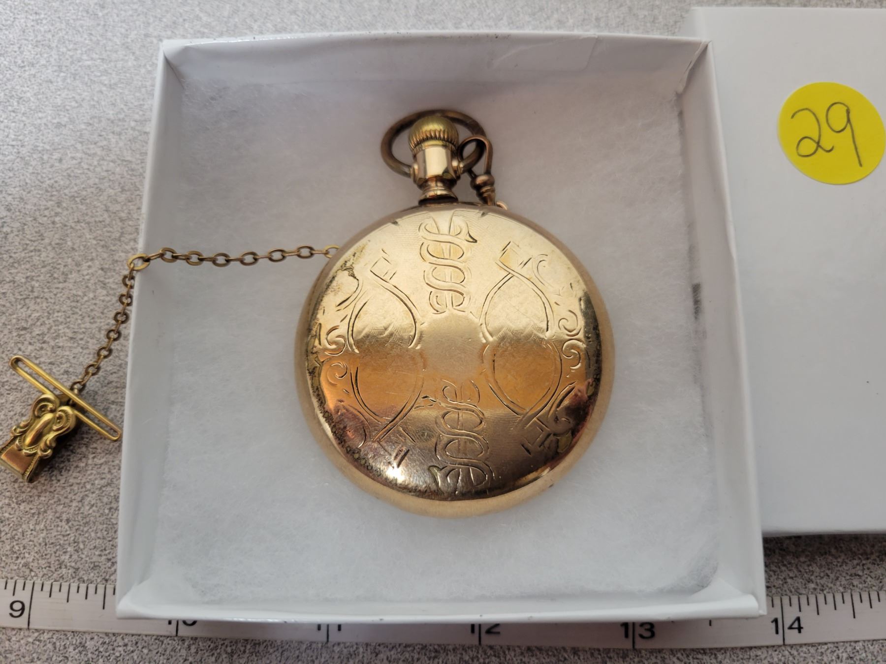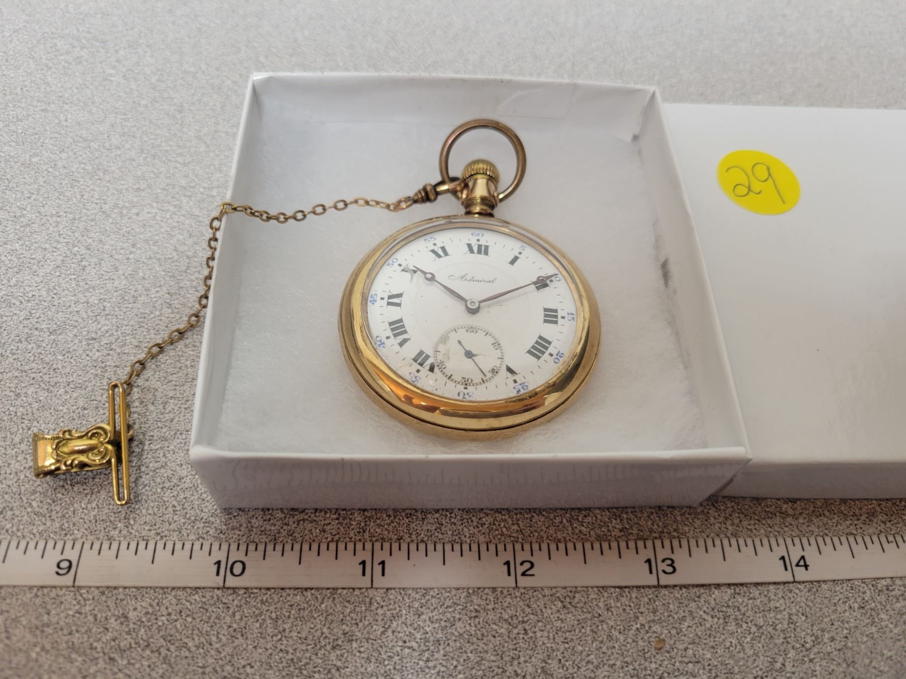 Admiral pocket watch size 16, nice designed engraving on the back - with gold filled bob