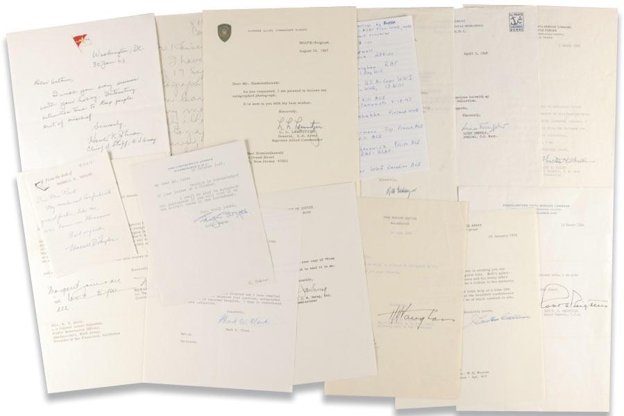 Fourteen ALSs and TLSs, all one page, ranging in date from the 1940s to the 1980s, each signed by a different admiral or general. ALSs are from Maxwell Taylor, Harold K. Johnson, and John R. Hodge. TLSs are from Mark W. Clark, L. L. Lemnitzer, Robert Eichelberger, Louis Denfeld, Edward Almond, signed “Ned,” Walton Walker, Robert Beightler, J. Lawton Collins, H. H. Vaughan, Leigh Noyes, and J. M. Swing. In fine condition, with expected folds, and wrinkling to a few letters.