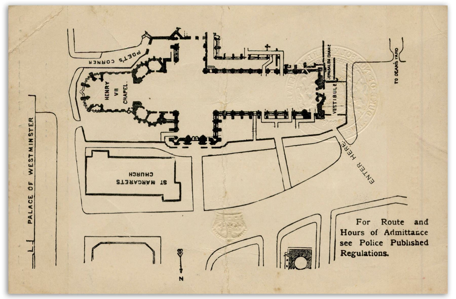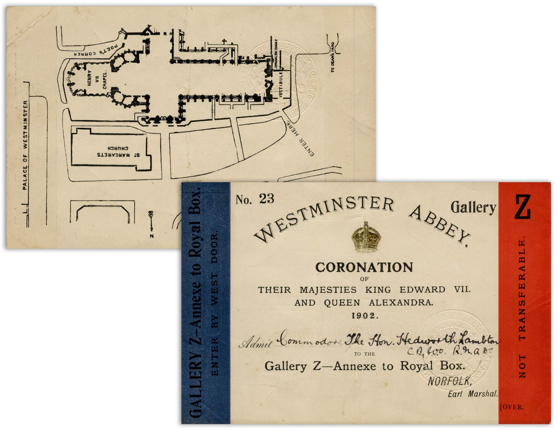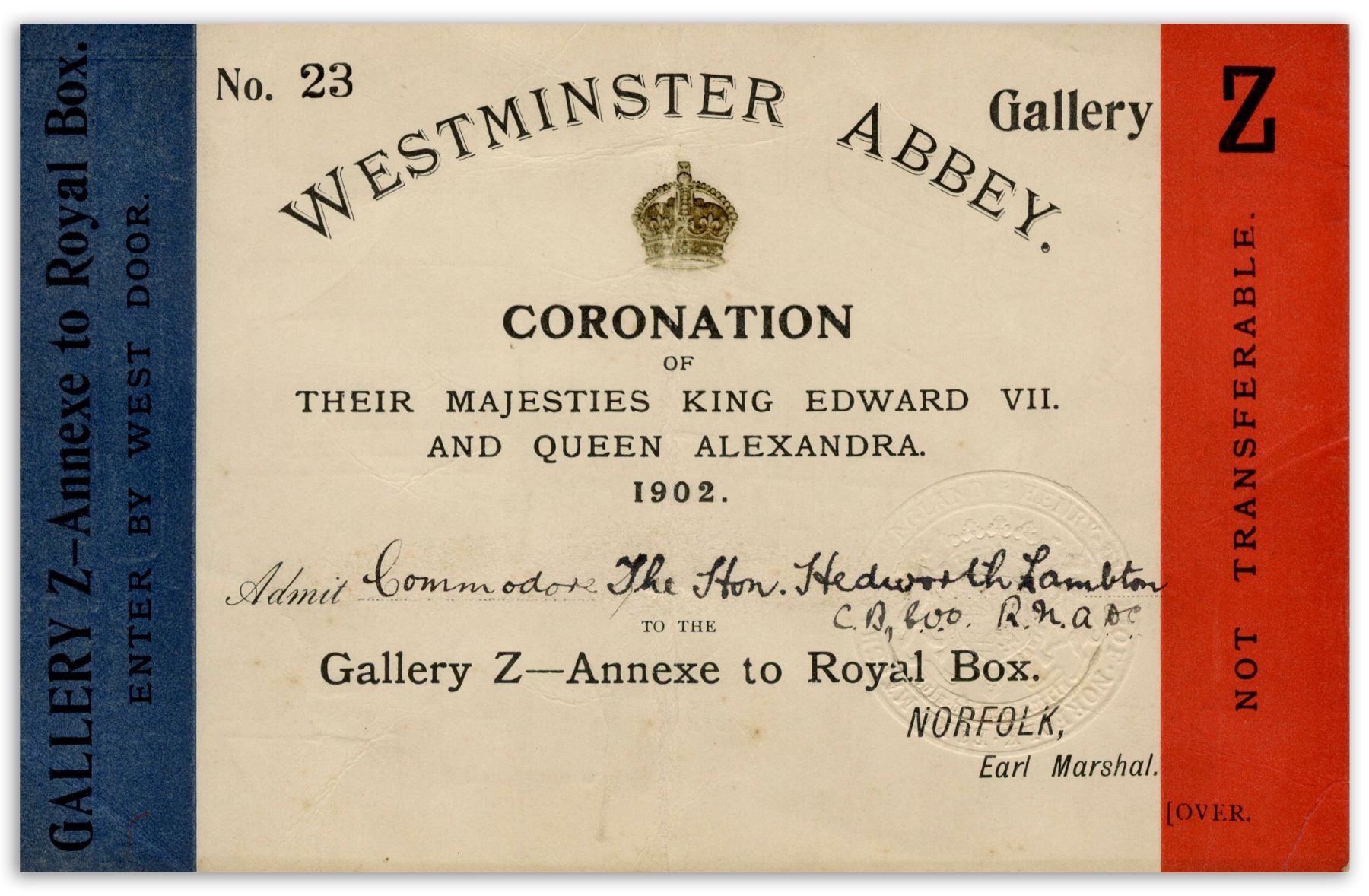 Admission card to the 9 August 1902 coronation of King Edward VII and his wife, Queen Alexandra. Ticket to Westminster Abbey is for ''Gallery Z-Annexe to Royal Box'', distinguished by the blue and orange borders of the card. Card is marked as ''Not Transferable'' for the sole use of Commodore Hedworth Lambton, who would go on to serve as Admiral of the Fleet in World War I. Card is embossed with the seal of the Earl Marshal, and measures 7.375'' x 4.875''. Mild wear and crease down center, in very good condition.