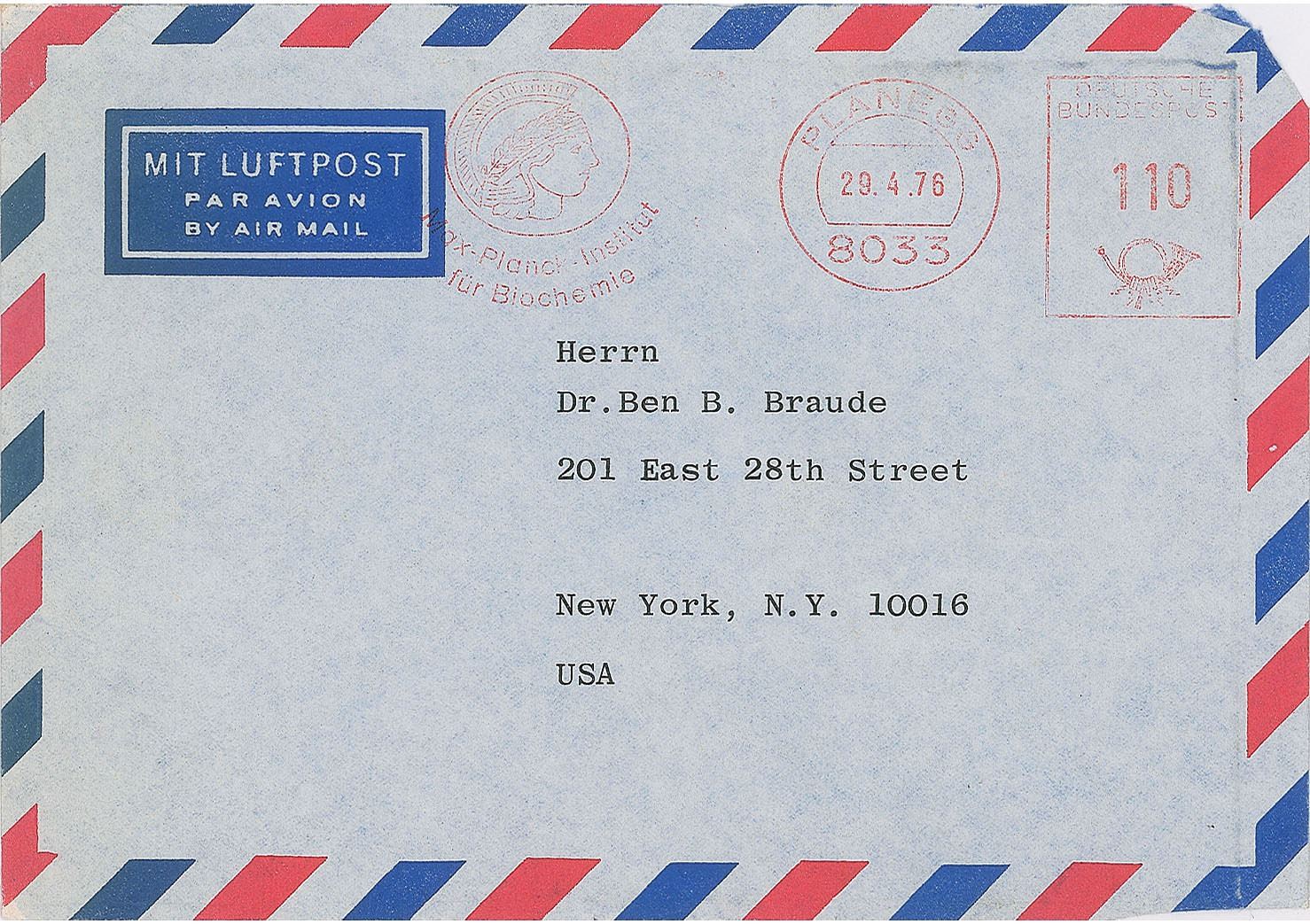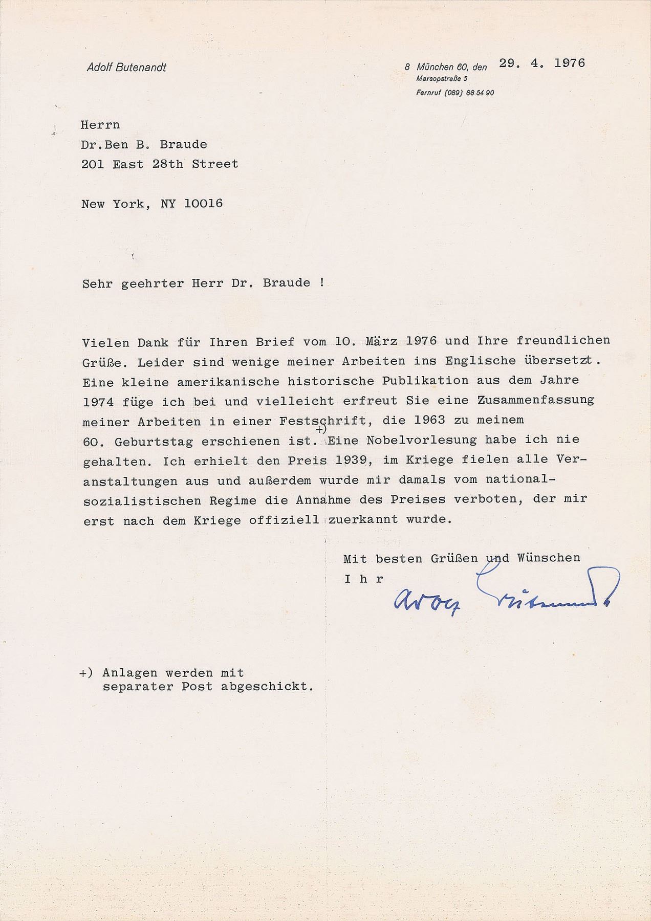 TLS in German,, one page, 8.5 x 11.75, personal letterhead, April 29, 1976. Letter to Dr. Ben B. Braude, in part (translated): "I never held a Nobel lecture. I received the prize in 1939, during the war all the events were canceled and, at the time, the National Socialist regime banned me from accepting the prize, which was officially awarded to me only after the war." In fine condition. Accompanied by the original mailing envelope.