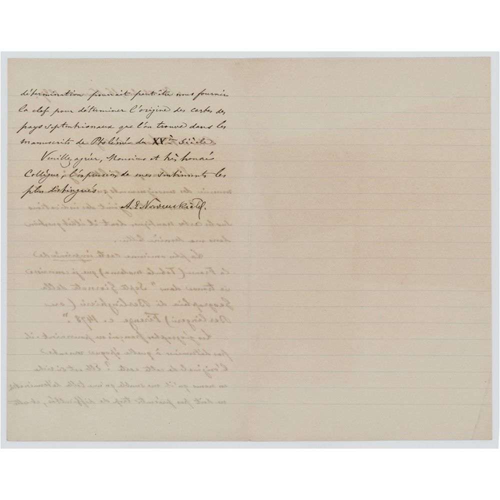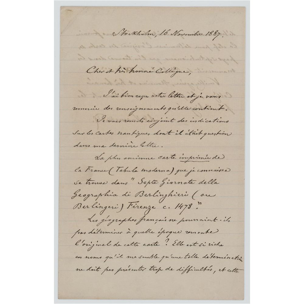 ALS in French, signed “A. E. Nordenskiold,†one page both sides, 5.5 x 8.75, November 16, 1887. Interesting handwritten letter concerning an old map printed in France in 1478, in part (translated): "Could French geographers not determine what period the original of this map dates back to? It is so rich in names that it seems to me that such a determination should not present too many difficulties, and this determination could perhaps provide us with the key to determining the origin of the maps of the northern countries that we find in the manuscripts of Ptolemy of the XVth century." In fine condition.