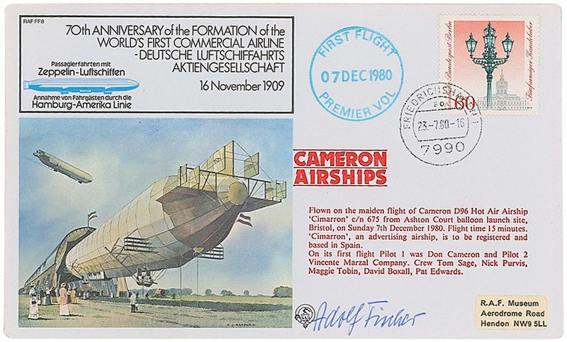 Flight mechanic who flew on the maiden voyage of the Hindenburg. Limited edition flown commemorative cover, 7.5 x 4.5, #1134/1466, with a cachet honoring the 70th anniversary of the formation of Deutsche Luftschiffahrts, signed in blue ballpoint by Fischer. In fine condition, with a small museum label affixed to lower right.