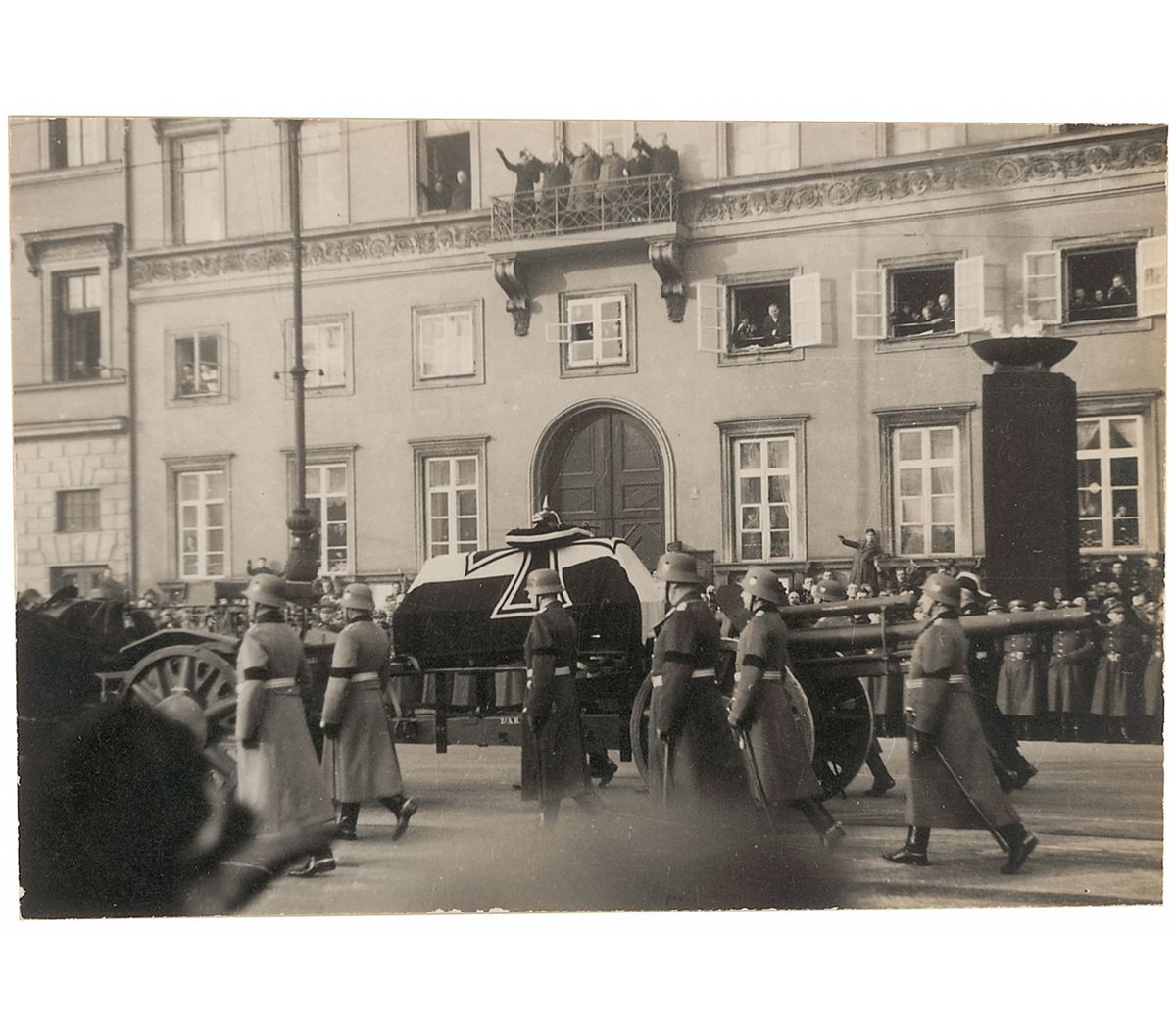 Ludendorff was one of the most prominent German military leaders and the chief engineer behind the management of Germany's effort in World War I until his resignation in October 1918. Postwar he became a nationalist leader and joined with Hitler in a failed attempt to seize power in the Beer Hall Putsch of 1923. Both were arrested, with Ludendorff and Hitler found guilty of treason and imprisoned; it was during this period in prison that Hitler penned his book Mein Kampf. By the time Hitler rose to power in 1933, Ludendorff had become a pacifist and no longer favored the Nazi party. When Ludendorff died on December 20, 1937, he was given—against his explicit wishes—a state funeral organized by Hitler, which is depicted here. A fascinating background story of the political conflict that resulted in Hitler’s rise to power.
