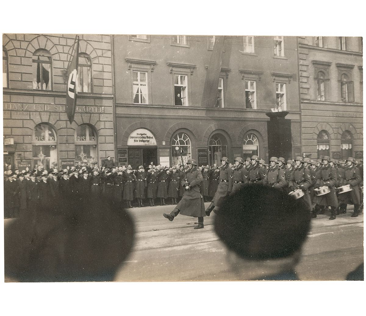 Unpublished photographic archive comprised of 16 matte-finish 4.5 x 3 photos showing Adolf Hitler and members of the army at the funeral march for General Erich Ludendorff in December 1937. The photos were taken by New York photographer Raoul 'Ral' Echeverria and affixed to both sides of one 11 x 14 scrapbook page. Hitler is seen in two images, walking alone in the procession; two others show close-ups of the casket, draped in an Iron Cross flag, passing by in the horse drawn caisson. The other images show a military band, soldiers lining the streets, and other members of the procession. In overall fine condition.
