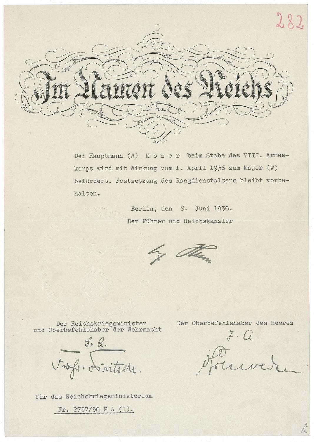 Early DS, in German, one page, 8.25 x 11.5, June 9, 1936. Untranslatated military document, boldly signed in the center by Hitler, next to the embossed Nazi seal, and countersigned by two other officers. In fine condition, with a central horizontal fold, a couple small pencil notations, and beginning of signature over edge of seal. A particularly crisp and bold signature on a well-preserved document.